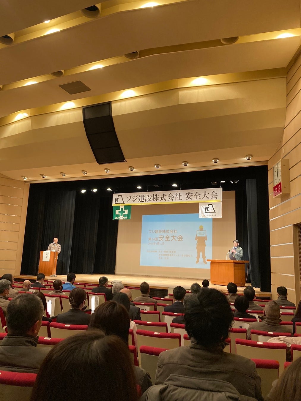安全大会冒頭の社長講和の中で、代表取締役である髙山靖徳は「『いってきます』と家を出たからには『ただいま』と元気よく帰宅することが、我々、働く者たちに課せられた義務なのです。当たり前の有難さをしっかりと噛み締めて日々の仕事に取り組みましょう!」と呼びかけ、フジ建設株式会社、及び、協力会社の社員一同は安全に対する思いを深めました。