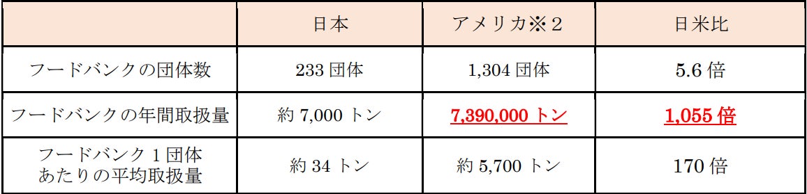 一方、アメリカのフードバンクの年間食品取扱量は739万トンで、これは国内の食品ロス発生量(523万トン)より多く、国内フードバンクの取扱量の1,000倍以上に相当します。このように、アメリカではフードバンクが膨大な量の食品ロス削減と、経済的な困難を抱える世帯への食料供給に大きく貢献しています。