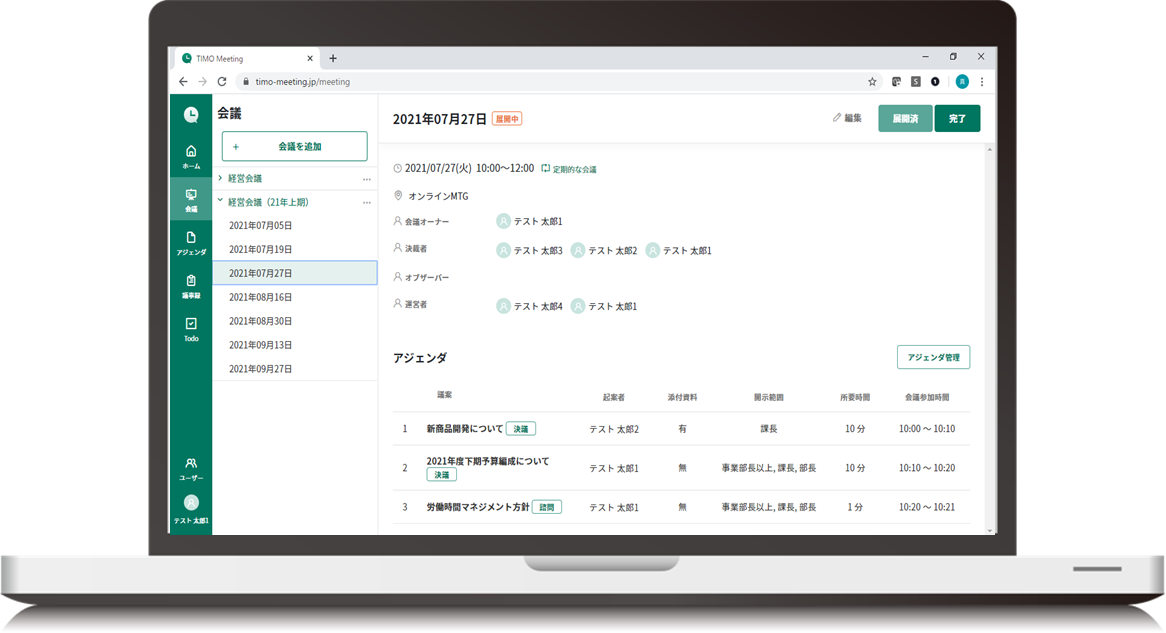 「TIMO Meeting」は、会議前~会議後までのプロセスをデジタル化と一元管理を通じて「会議品質の向上、会議時間の削減」を実現するミーティングマネジメントツールです。「会議運営の効率化」や「アジェンダコントロール」「会議の質向上」につながる機能を搭載し、メンバー レベルの会議から経営会議に至るまで対応します。