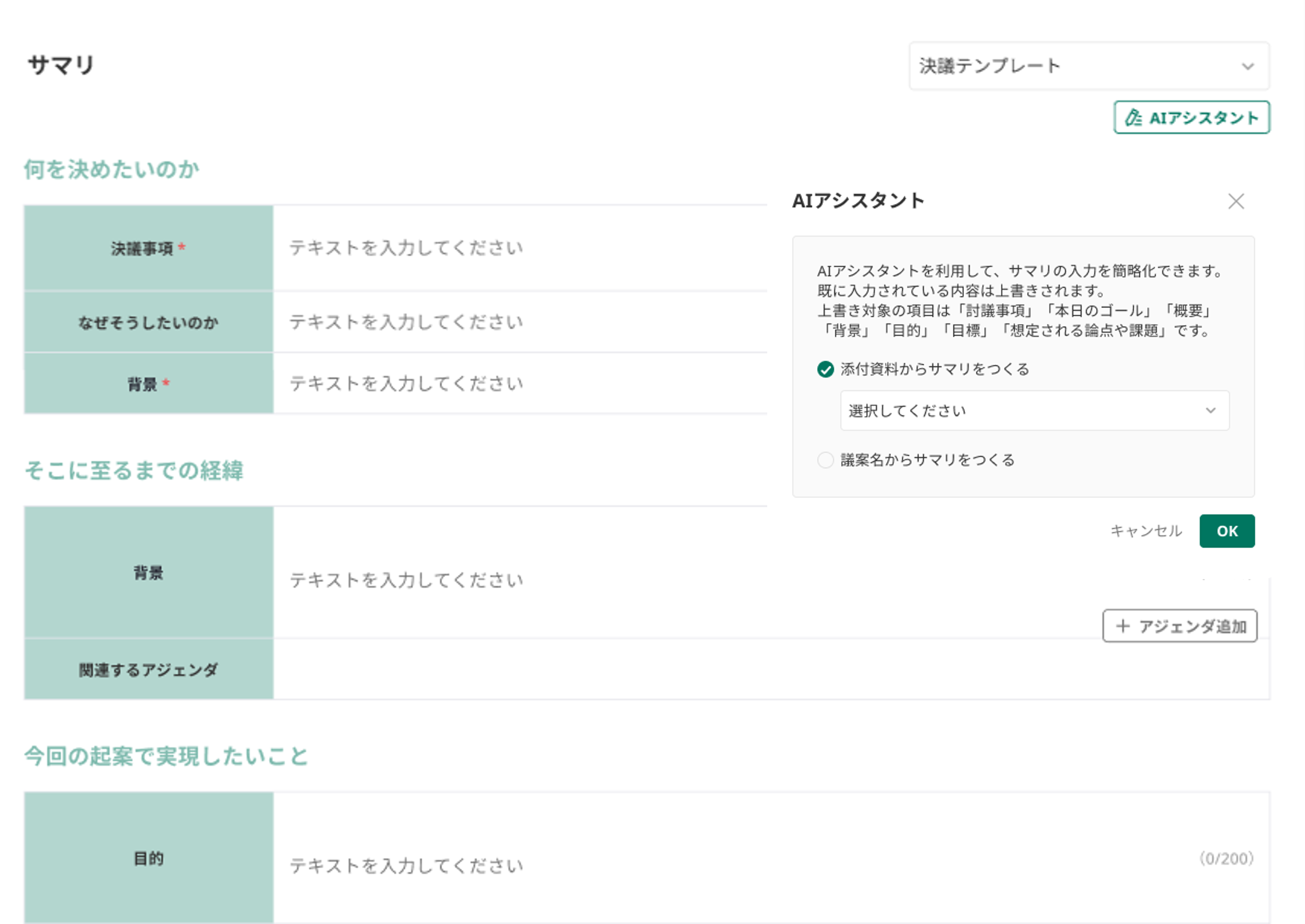 添付資料を読み込んで会議体にあったテンプレート(決議・議論・報告)に沿ったサマリーを自動生成し、アジェンダの作成時間を削減します。