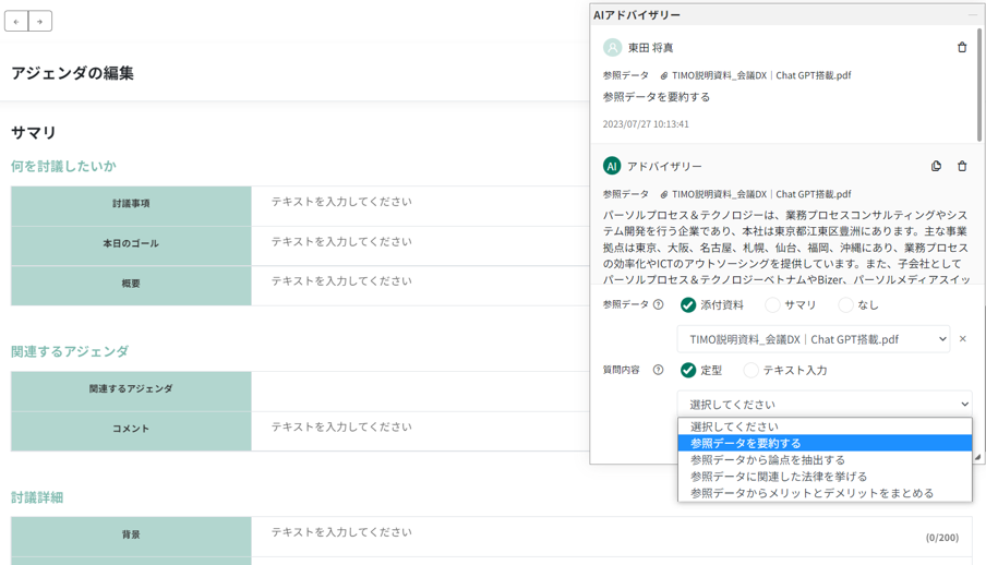 添付資料やサマリーに対して、法務的な観点、コンプライアンス的な観点など、AIを活用することで内容を精査し、アドバイスが受けられます。これにより、ブラッシュアップされたアジェンダを作成することができ、質の高い会議が実現可能になります。