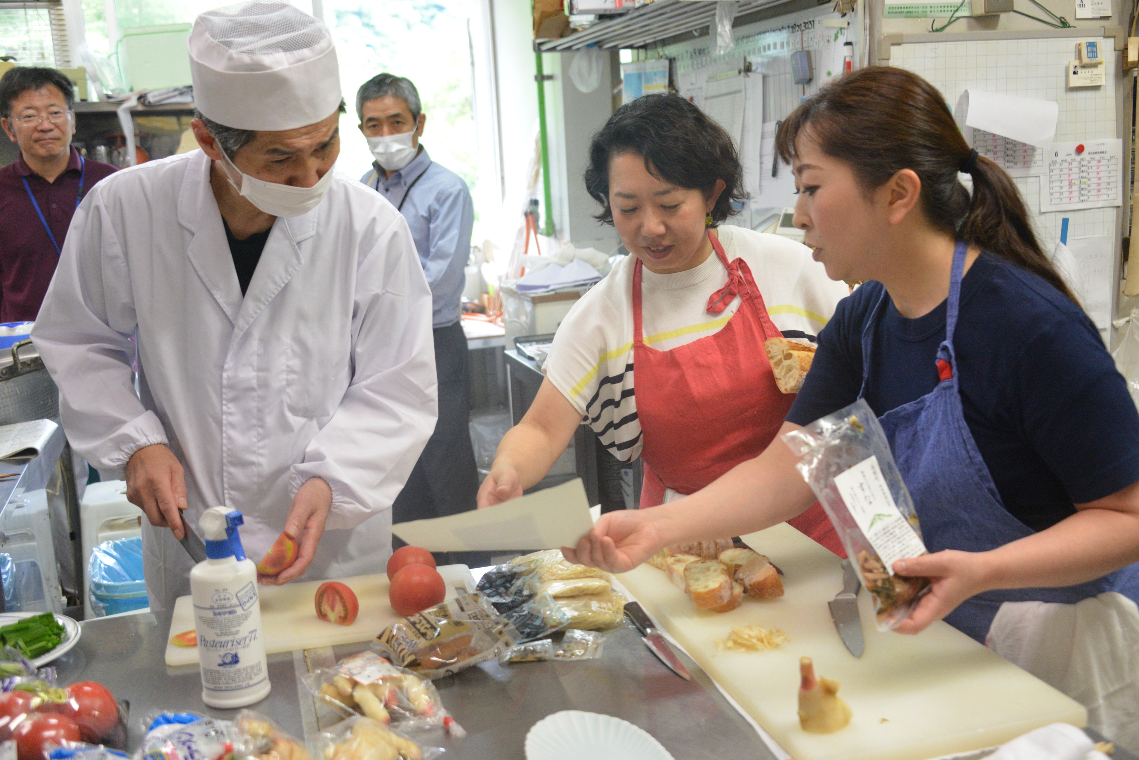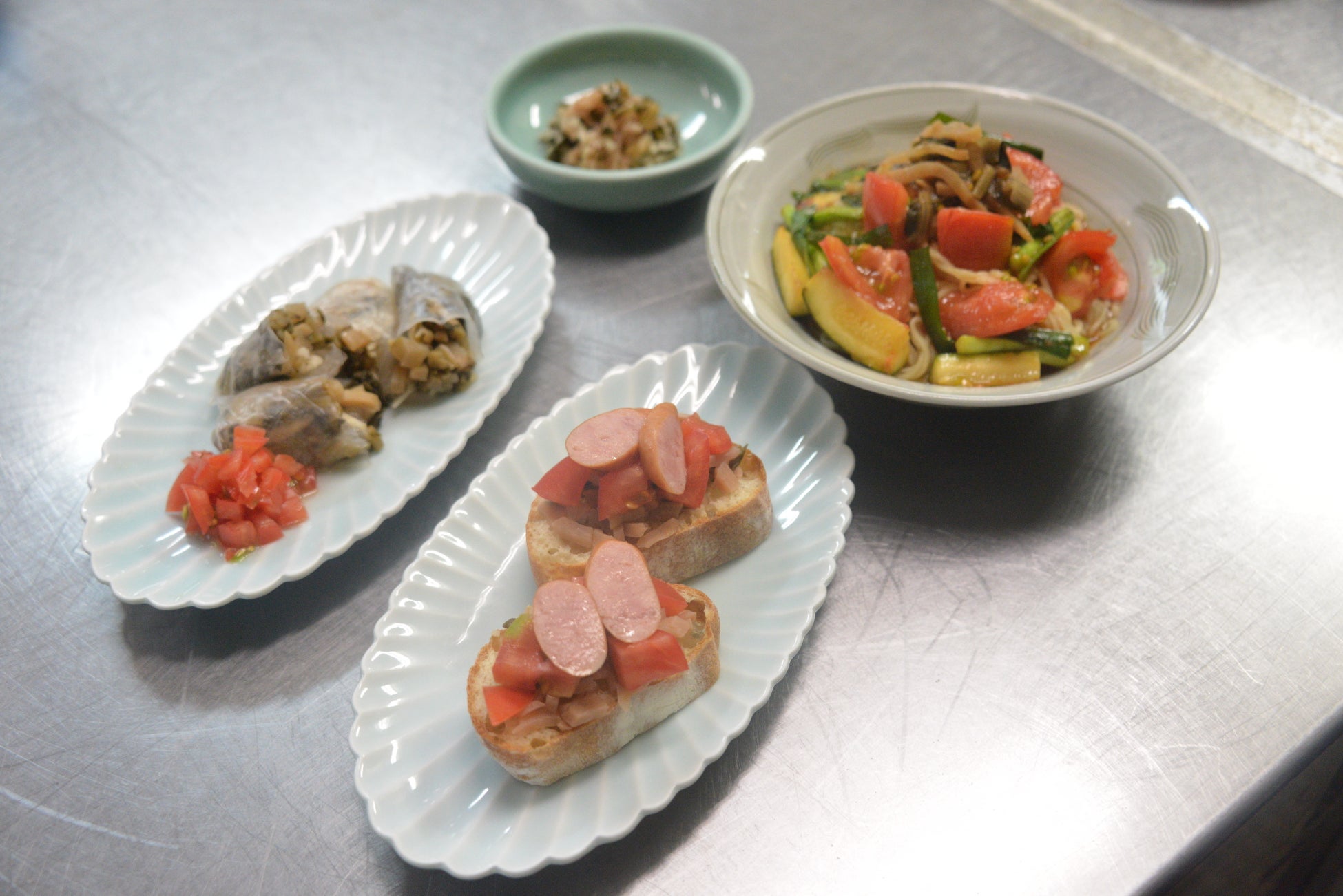 身体によい成分がたくさん含まれる「すな」ですが、同町内外でも消費が広がって欲しいという思いから、市が山崎さんにレシピ開発の協力を依頼しました。今回のレシピは、「すな」は加熱せず、調味料も極力使わず、食事に添える”ちょいすな”というコンセプトで、パンに刻んだトマトと「すな」をのせた「ブルスケッタ」と生春巻き、冷やし中華の3品を作って試食しました。「すな」の本来のおいしさを活かした料理に、参加者からは「さっぱりしていて美味しい」との声があがりました。
