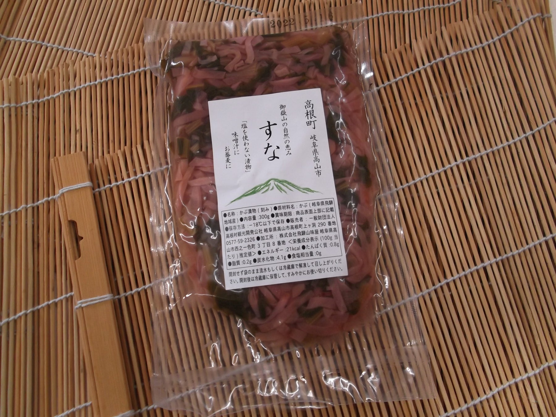 「すな」は、高山市高根町の日和田地区、小日和田地区、留之原地区に古くから伝わる冬の保存食で、塩を一切使わずに乳酸発酵させた強い酸味が特徴の赤かぶの漬物です。岐阜県食品科学研究所が、「すな」から取り出した優良な乳酸菌を「高根株」として特許出願しており、同所の分析で、血圧を下げる作用が期待できる量のGABAや、貝類などに多く含まれるうまみ成分のコハク酸が含まれることも判明しています。
