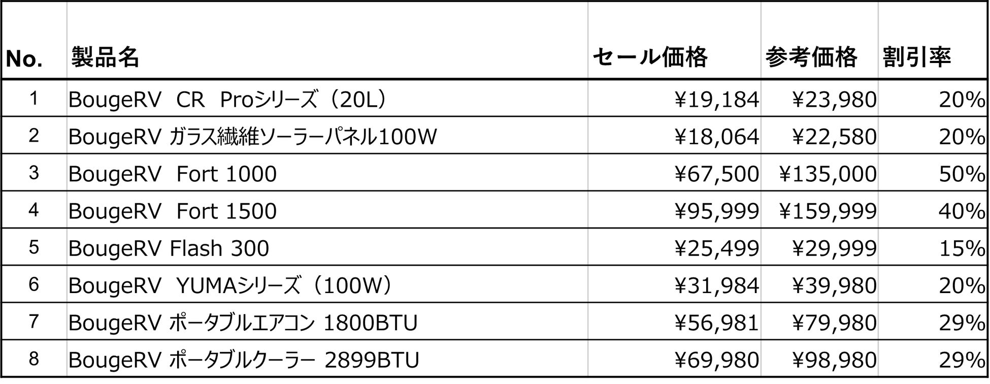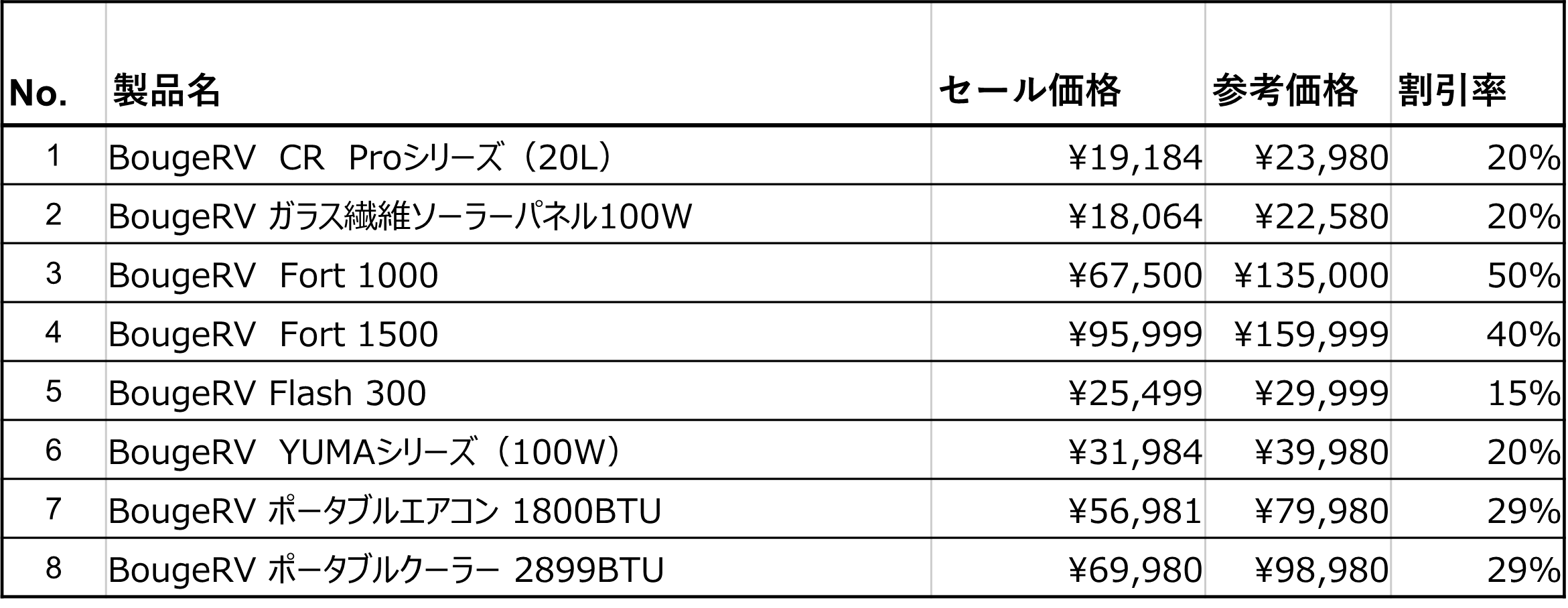 大人気アウトドアメーカー BougeRV「BougeRV CR Proシリーズ」や「BougeRV Fort 1000」「BougeRVガラス繊維ソーラーパネル100W」が最大50%オフ!