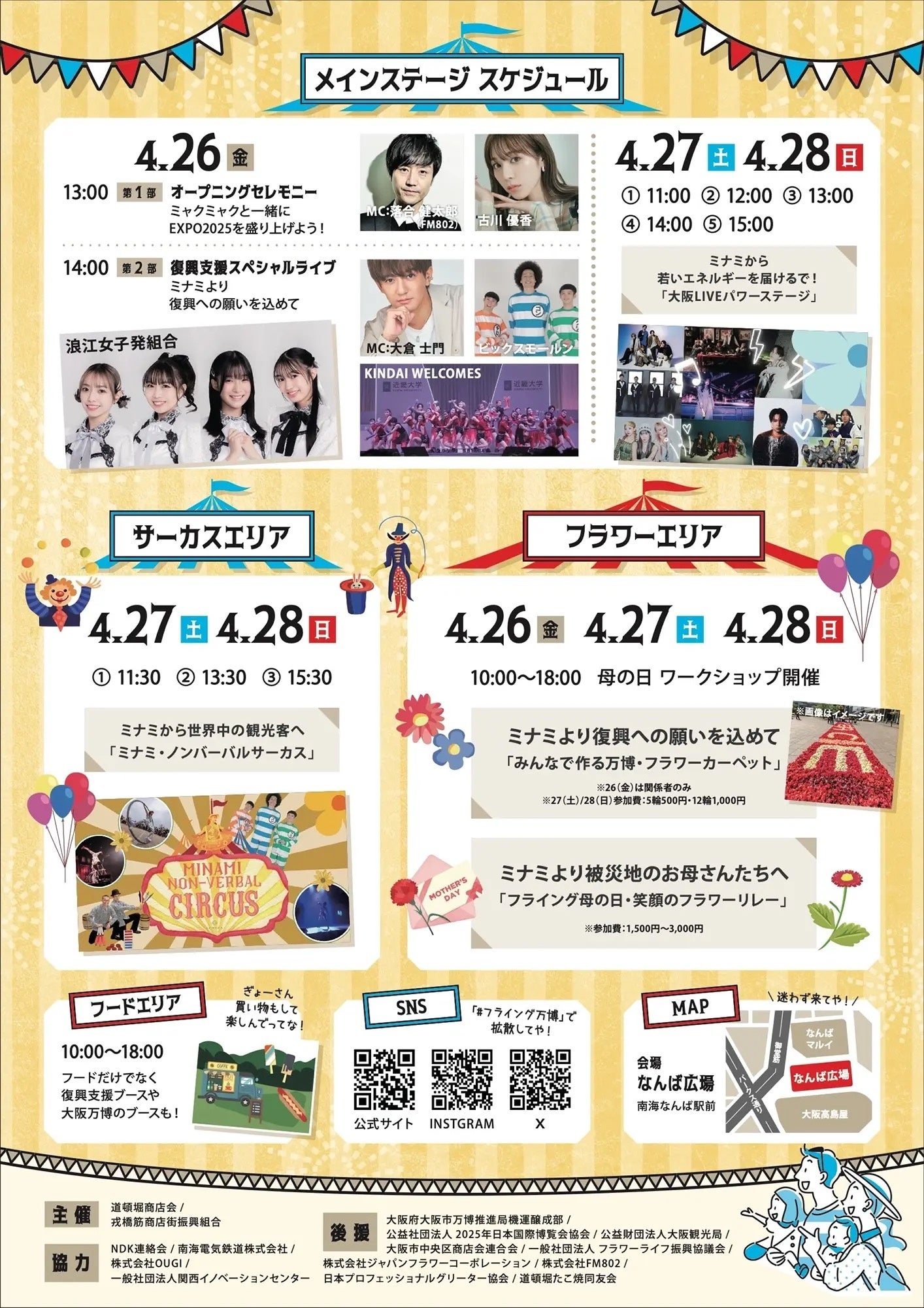 来たる4月26日(金)、世界中の観光客が行き交う「なんば広場」(約6,000㎡)にEXPO2025公式キャラクター・ミャクミャクや大阪市長・中央区長、大阪ゆかりのアーティストをはじめ、全国各地から復興支援の取り組みに賛同してくれたアーティストたちが駆けつけ、オープニングセレモニー&復興支援ライブ(入場無料)を実施。そしてGWを迎える4月27日(土)・28日(日)にかけて計3日間、ミナミの町衆が一体となってEXPO2025を盛り上げるとともに、能登半島地震復興支援を目的とした参加型イベントを繰り広げます。