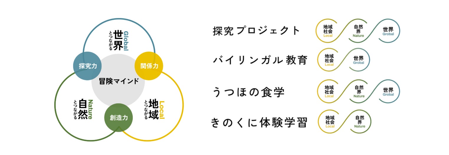 うつほの杜学園は、「熊野古道を世界とつながる学びの聖地へ」を目標に掲げた探究型グローカルスクールを実現する小・中学校です。