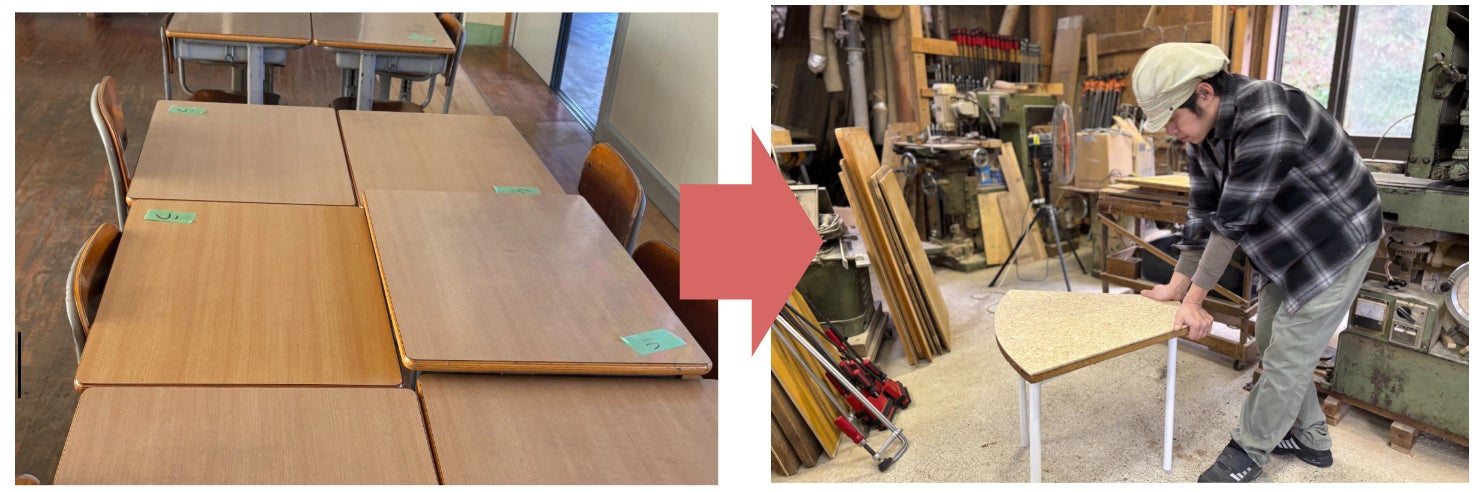 当学園では、「より良い社会と教育を」を理念に「サステナブルでウェルビーイングな学校づくり」を掲げ、行政、地域住民、関連企業など様々なステークホルダーがつながる学校コミュニティの中で、学校を軸につながり合い、学びや挑戦を行う学校づくりを目指しています。この「サステナブルな学校づくり」の一環として、この度コクヨ株式会社様と協働し『学習机再生プロジェクト』を行いました。使われなくなった学習机から出る“廃天板”は、一般的にリサイクルが難しいと言われるメラミン(樹脂)が使われていますが、うつほの杜学園として生まれ変わった「旧二川小学校」で使用されていた学習机の廃天板を再生し、新たな材として、学内のデザインに生まれ変わります。
