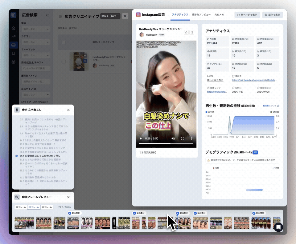動画広告のフレーム(構成・カット割)分析機能、音声文字起こし機能