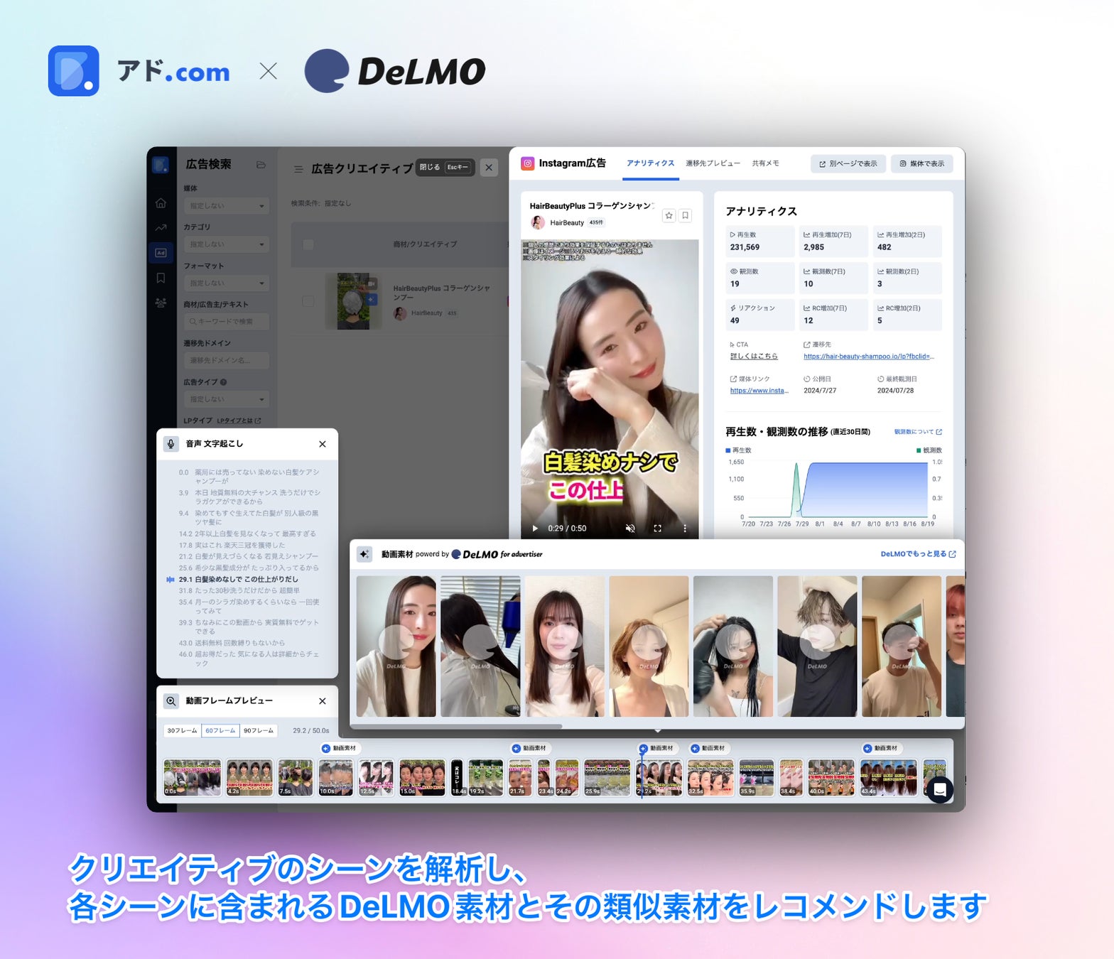「アド.com」上で提供する、動画クリエイティブを独自のAI技術で解析する動画フレーム分析機能(特許申請済)を活かし、動画クリエイティブに含まれる「DeLMO」の動画素材と類似動画素材をスピーディに収集できる新機能を共同開発いたしました。