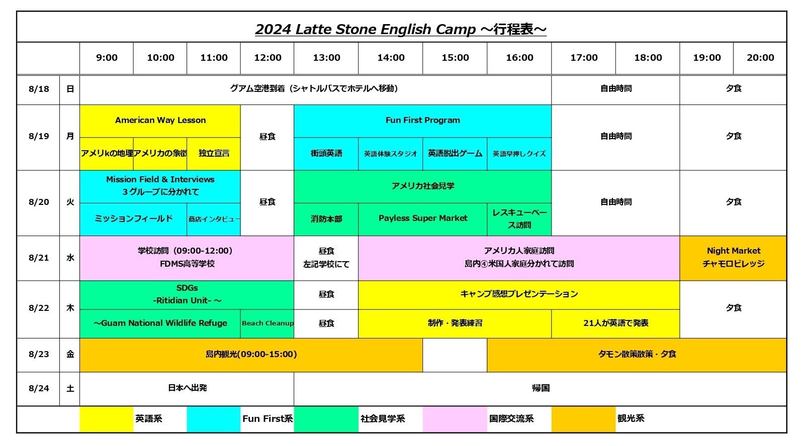 第1回ラテストーン英語キャンプは2024年8月18日から24日まで5泊6日の日程で行われました。日程表は下図の通りです。英語力を集中的に高めるというのが多くの英語キャンプの主眼ですが、このキャンプでは、これに留まらず、英語を楽しむプログラム、アメリカの社会見学、現地の人たちとの国際交流の視点を加え様々な独自コンテンツを配置し、若者の国際感覚を総合的に醸成します。