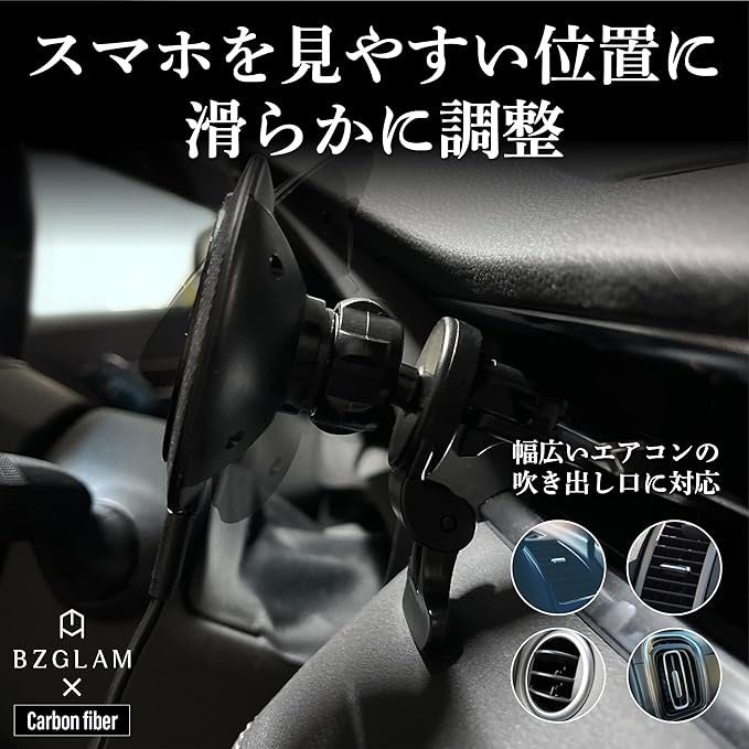 この設置方法に「MagSafe(マグセーフ)」機構を取り入れることで、更に見た目をシンプルにしたものが、【BZGLAM(ビズグラム)】ブランドのベストセラー「車載MagSafeカーボン充電器」となります。