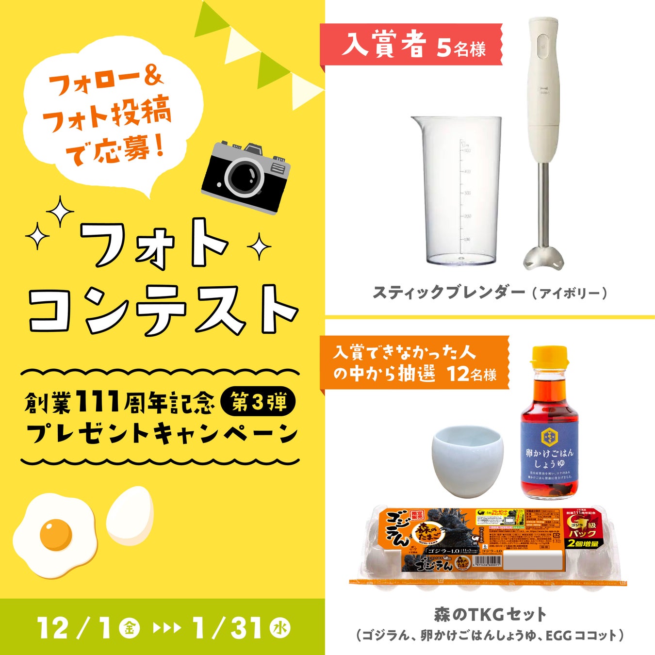 入賞できなかった人の中から抽選:森のTKGセット (ゴジラん、卵かけごはんしょうゆ、EGGココット) 12名様