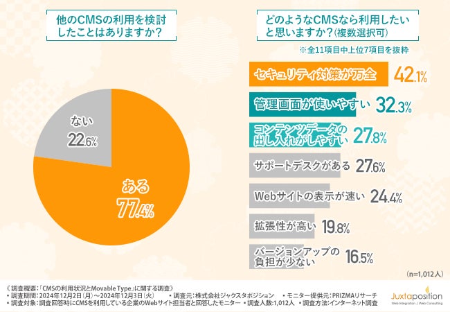 続いて、「他のCMSの利用を検討したことはありますか?」と質問したところ、約8割の方が『ある(77.4%)』と回答しました。