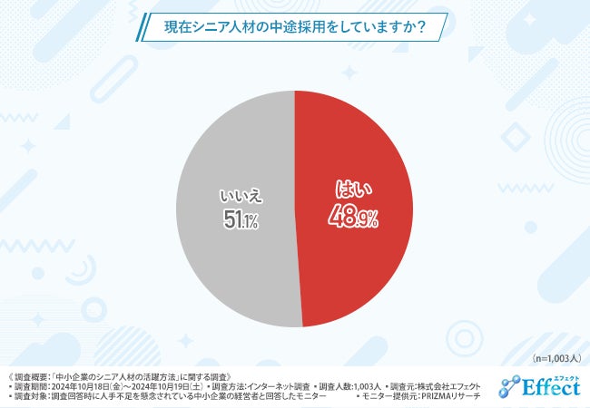 「現在シニア人材の中途採用をしていますか?」と質問したところ、『はい(48.9%)』と約半数の回答がありました。