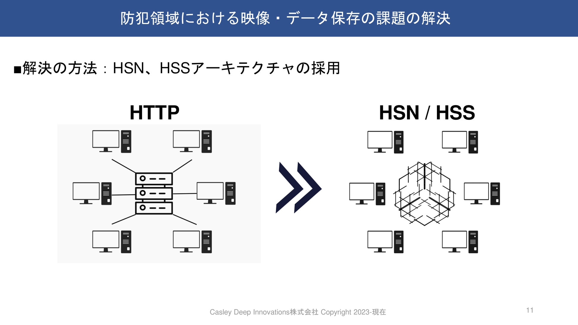 「ハイパー・セキュア・ストレージ(HSS)」は、web3.0で構築された秘密分散技術で、複数の既存ストレージを活用してデータを断片化、暗号化、分散化して保存します。これにより、監視カメラ映像のデータを理論上無制限に保存することが可能となります。
