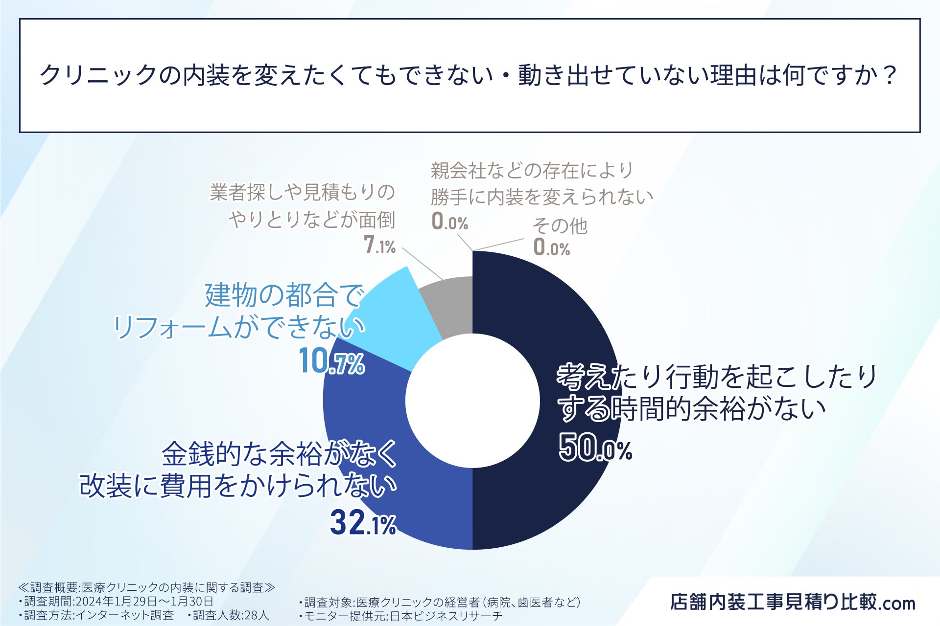 また、クリニックは駅ビルなどの建物に併設されているケースもあり、「建物の都合でリフォームができない」といった意見も、少数ではありますが見受けられました。