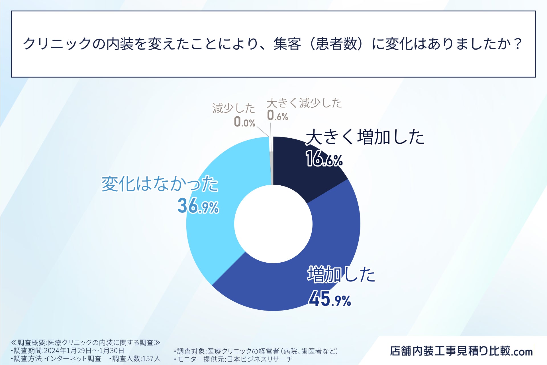 なんと内装を変えた医療クリニックの6割以上が、患者獲得数が「増加した」と回答したのです。中でも「大きく増加した」という回答は全体の16.5%を占め、内装の変更が患者に対して良い結果をもたらしていることが分かります。