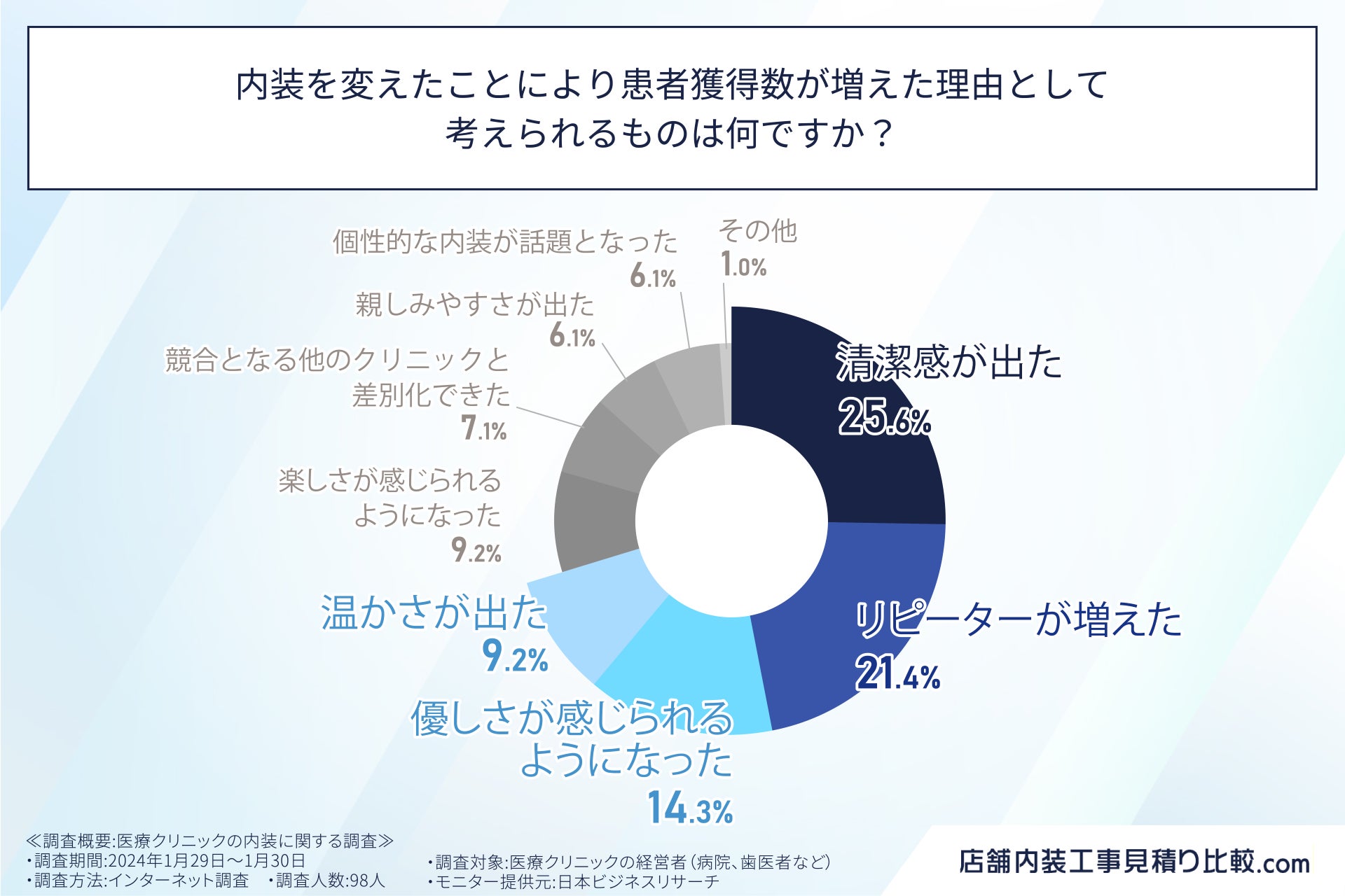さらに、内装変更により患者獲得数が増加したと答えた98名を対象に、理由について詳しく調査しました。