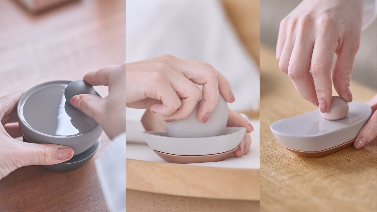 本商品は、日本の書道文化にも馴染み深い「擦る」という所作から発想した新たなアロマストーンです。石らしい重みや自然物の風合いを活かし、"擦る"ことで香りを広げ、石が心にもたらす落ち着きやときめきを届けます。