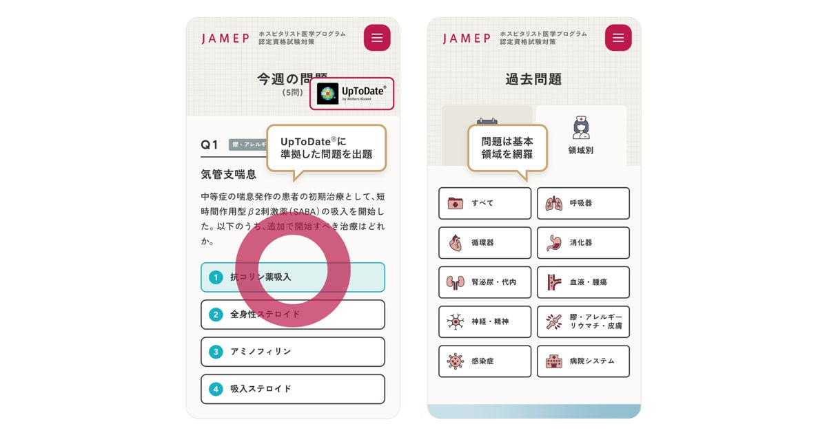 このプログラムでは、世界標準のエビデンスに基づく臨床意思決定支援ツールUpToDate®︎に準拠した選択式の問題を毎週5問、LINE公式アカウントから配信します。問題は、優れた臨床家で構成されたJAMEPの問題作成委員と、専門家からなる査読者チームの協力のもと作成されています。回答後すぐに正答と解説を読むことができ、スキマ時間を活用しながら効率的に知識を習得できるよう設計されています。LINE公式アカウントに友だち登録することで、無料で利用可能です。(友だち登録用URL:https://lin.ee/f9qunrr)