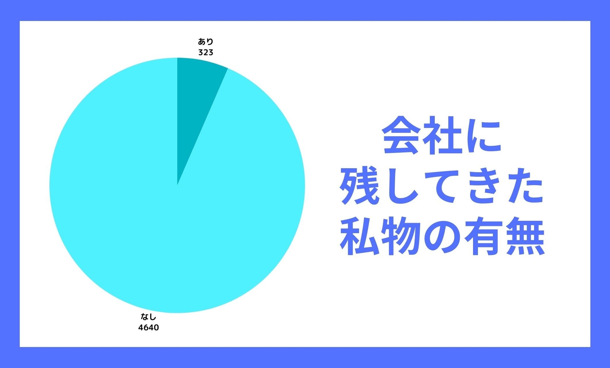 私物を会社に残している人が323人、残していない人が4640人でした。退職代行を実行する場合、私物は郵送にて会社から送っていただけます。会社へ取りに行く必要はないため、安心してご利用ください。また、会社からの貸与物に関しましても、基本的には郵送での返却となります。