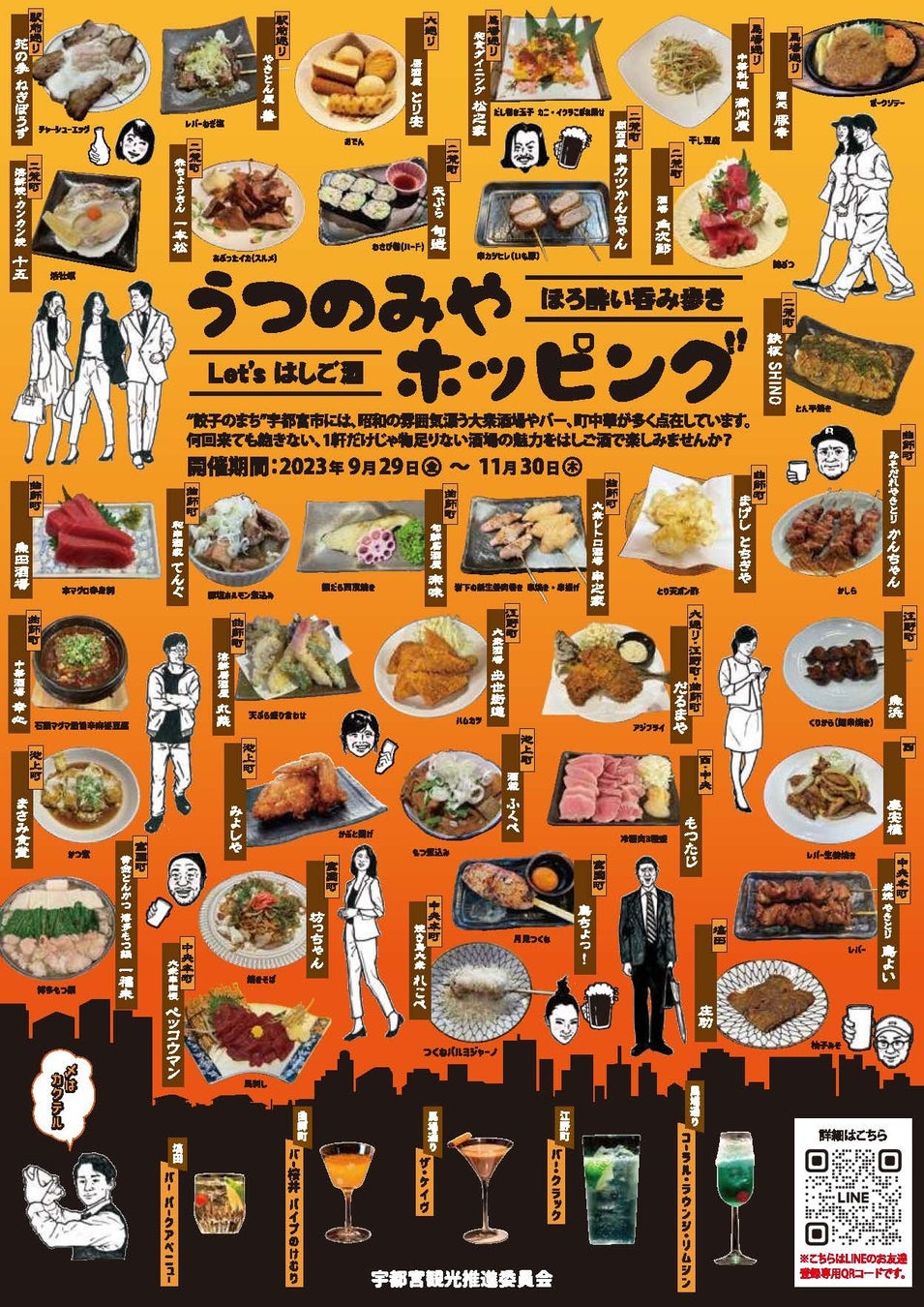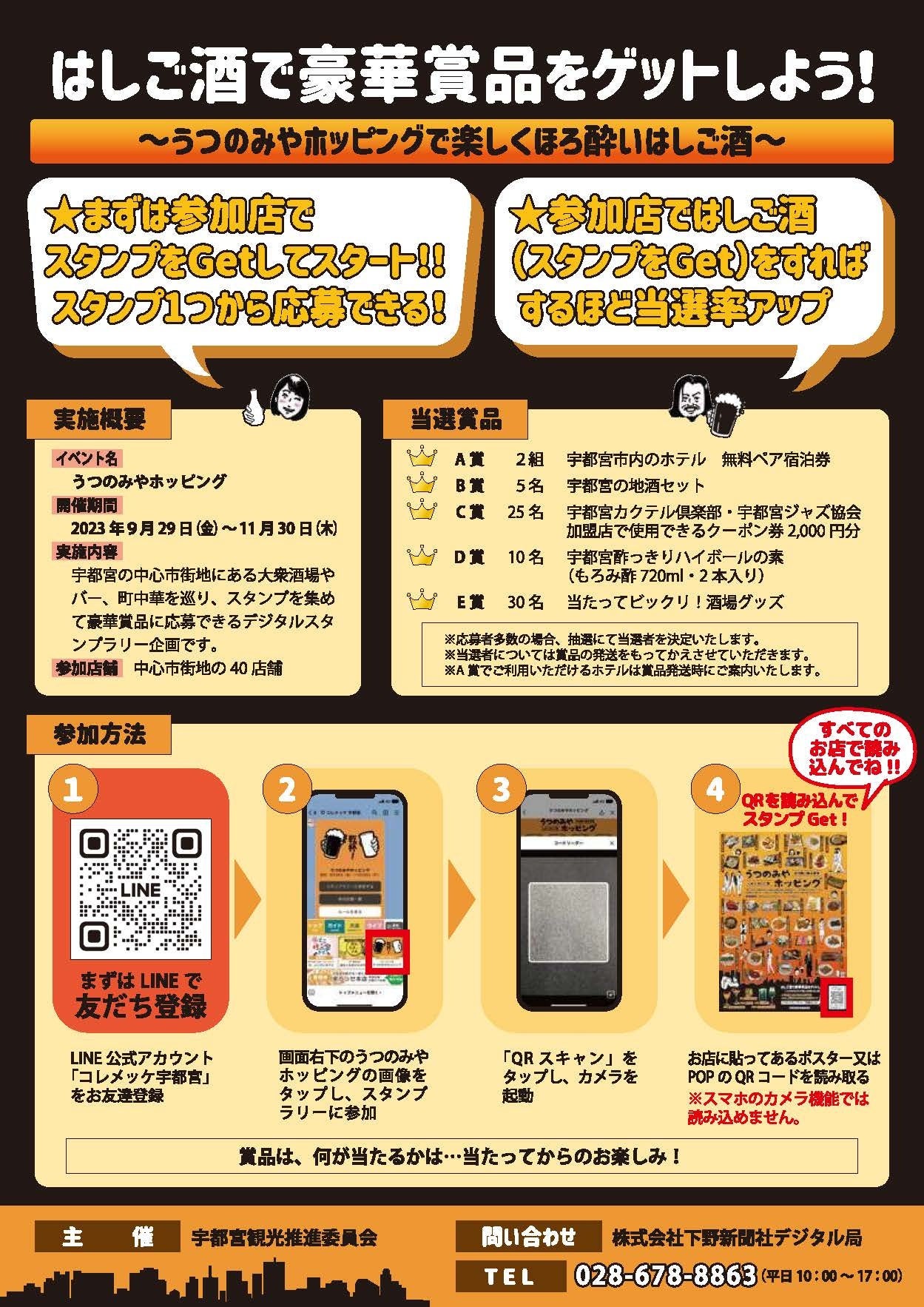 宇都宮の夜を満喫してもらうため,「食」,「酒」をはじめ,「ジャズ」や「カクテル」などの魅力を発信し,夜のにぎわい創出と観光客の滞在時間の延長,宿泊客の増加等を図ることを目的に,宇都宮の中心市街地にある大衆酒場やバー,町中華を巡り,スタンプを集めて豪華景品に応募できるデジタルスタンプラリーを実施します。参加店舗でスタンプを獲得すればするほど,当選率がアップしますので,是非コンプリート目指してホッピングを楽しんでください。