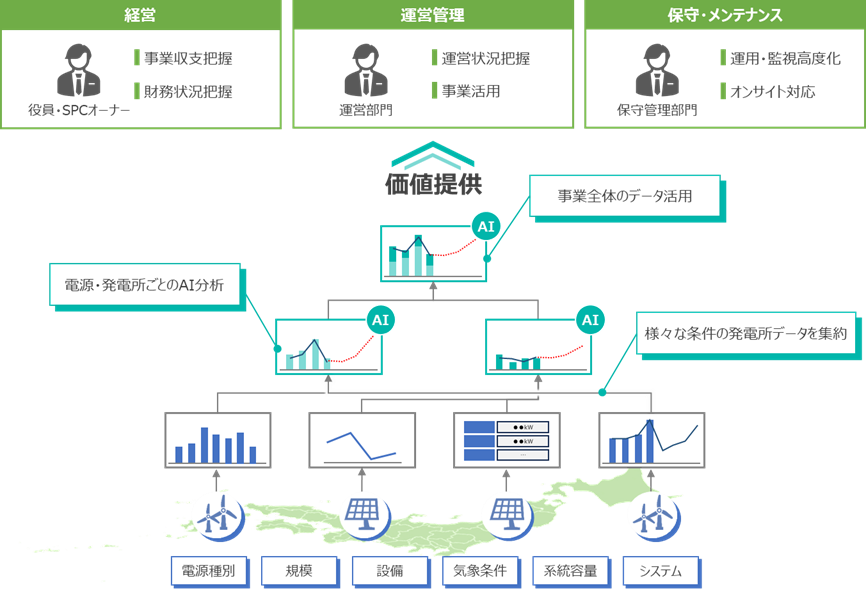太陽光発電や風力発電は天候などの自然条件に影響を受ける不安定電源であり、これらの発電所を多数保有しながら、安定的かつ効率的に再生可能エネルギー発電事業運営を行っていくためには、事業データの統合的な管理・分析・活用が必要となります。
