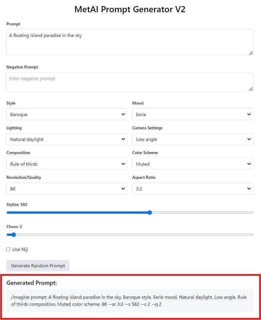 ・包括的な設定: プロンプト、ネガティブプロンプト、スタイル、ムード、ライティング、カメラ設定、構図、カラースキーム、解像度/品質などのオプションを含みます。