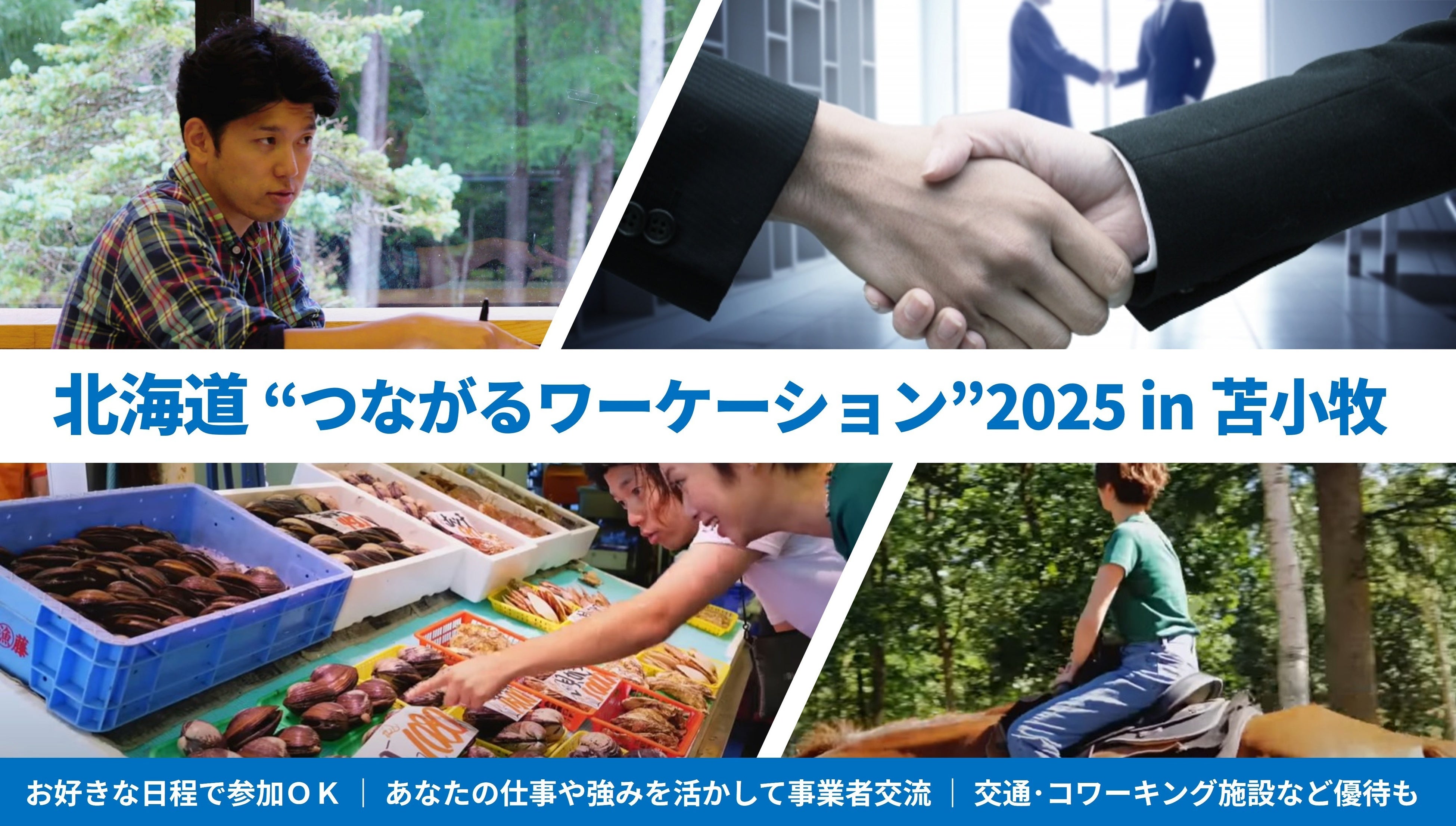 なお、本キャンペーンにおける事業者交流のすすめ方については、ご自身の「職種・ビジネス内容」や「強み」「知見」「ご経験」に基づく【自薦マッチング】と、ワーケーション滞在者との交流を歓迎する市内事業者候補の中から選択いただく【候補者マッチング】の2種類から、お好きな方法にてご利用いただけます。詳しくは、市の滞在応援WEBサイト( https://tomakomai.info/featured_category/matching/ )、ならびに本キャンペーン申請先ページ( https://tomacation2025.peatix.com/ )にてお確かめください。