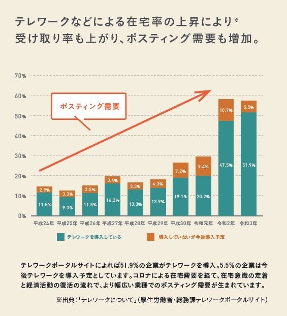 市況として、テレワーク等の普及が進んだことによって在宅率が上がりポスティングチラシの需要が増加傾向にあります。また、ポストに入ったチラシを自宅に持ち帰って悩んで、家族と相談してから、再度見直したタイミングで決めたというチラシを手に取った方からの声もあり、より広いエリアに拡大したりチラシ数量を増やして効果を試したいという企業も増えています。(図1参照)
