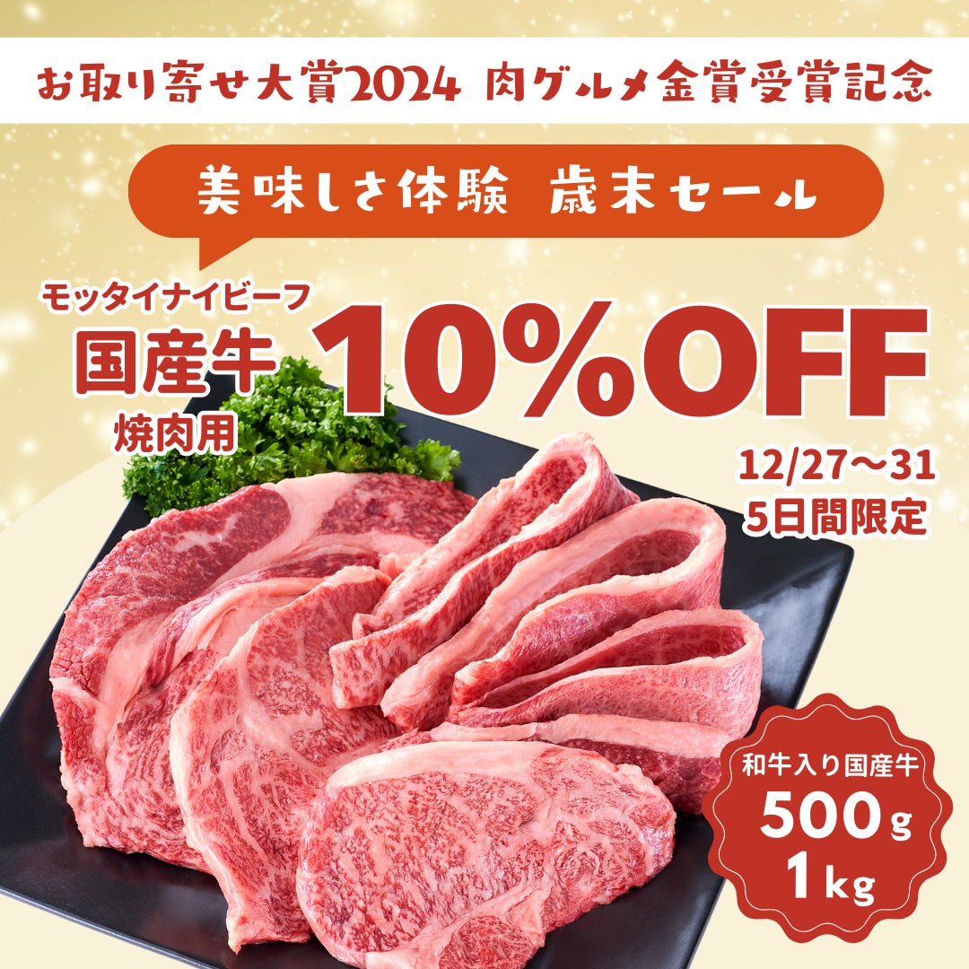 受賞を記念しまして、モッタイナイビーフ公式オンラインストアでは2024年12月27日(金)から31日(火)にかけて“おいしさ体験 歳末セール”として、受賞した「モッタイナイビーフ 国産牛 焼肉用」が10%OFFでお買い求めいただけるセールを実施中です。
