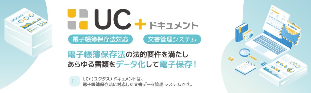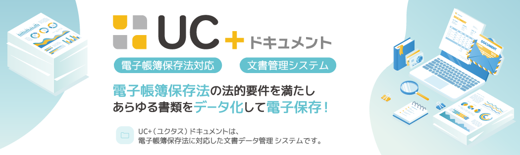 UC+(ユクタス)ドキュメントは、電子帳簿保存法の法的要件を満たし、あらゆる書類をデータ化して電子保存するクラウド型文書管理システムです。ERPや基幹システムとシームレスに連携し、オフィスのペーパーレス化を支援します。