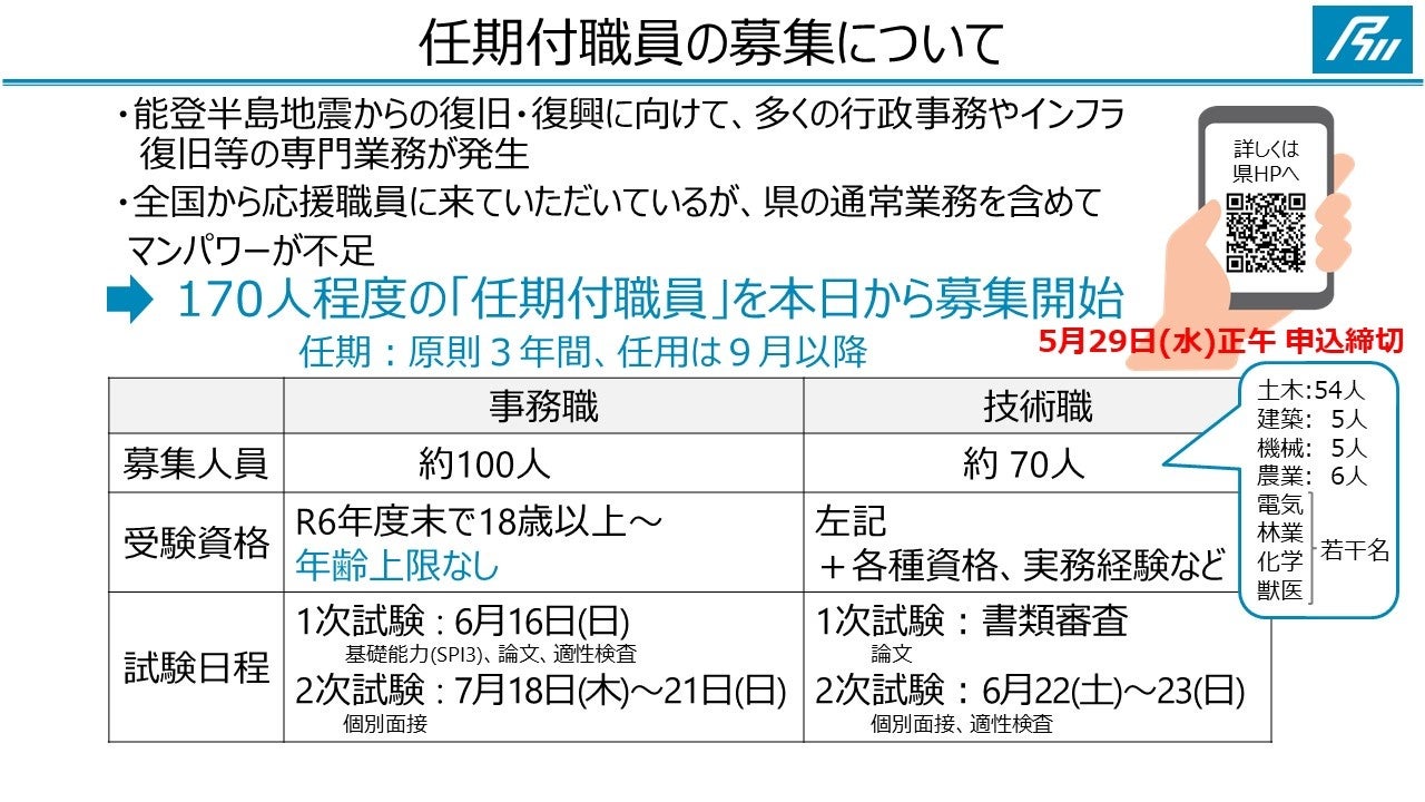 令和6年能登半島地震からの復旧・復興に向け、様々な事業を実施していく上で一時的に増加する業務に対応するため、任期の定めのある任期付職員を募集します。