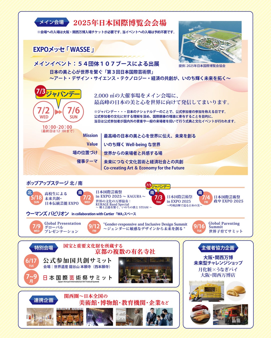 「日本博2.0」にも採択された本芸術祭は、「アート・デザイン・サイエンス・テクノロジー・経済の共創 ~ 日本の美と心を世界に伝え、未来を創る」をミッションに、大阪・関西万博会期の6ヵ月間、開催します。