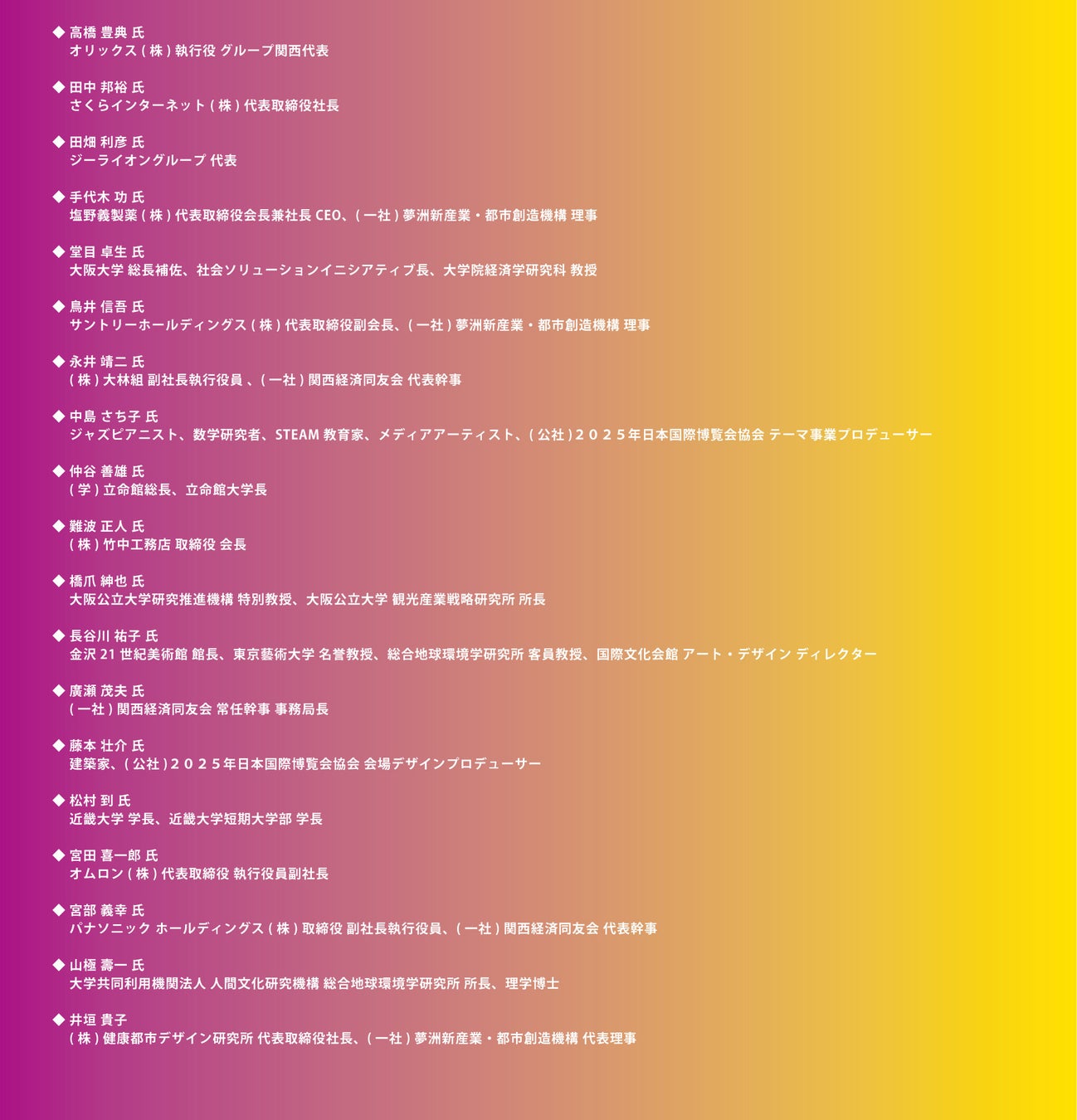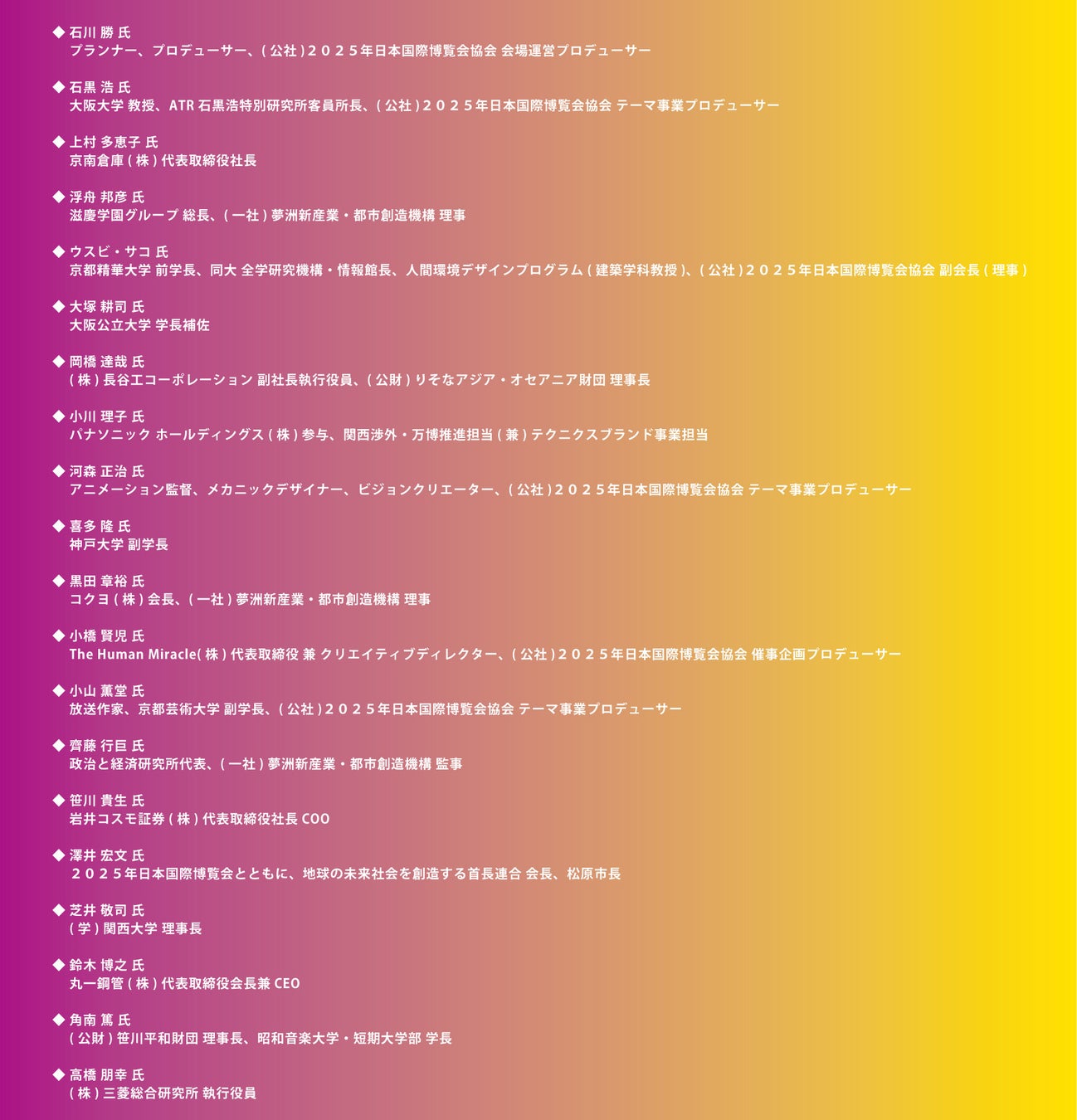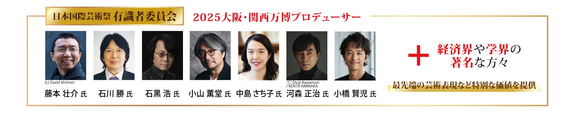 「日本国際芸術祭 有識者委員」には、2025年日本国際博覧会プロデューサー や経済界や学界や官界の著名な方々にご就任いただいております。