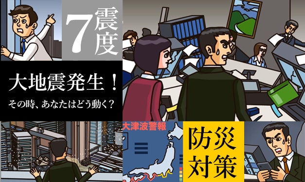 オフィス勤務、在宅勤務、外勤など多様化した労働環境下で大規模地震が発生した状況を疑似体験し、従業員がとるべき避難行動や防災対策をクイズ形式のアニメーションを通じて学習することで、従業員の災害対応に対する危機意識を高め、基礎的な災害対応を身につけます。