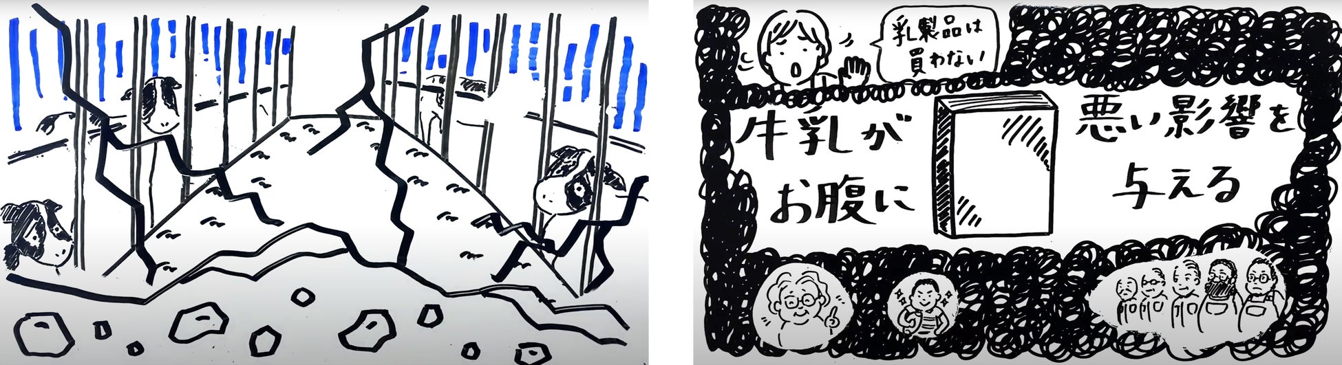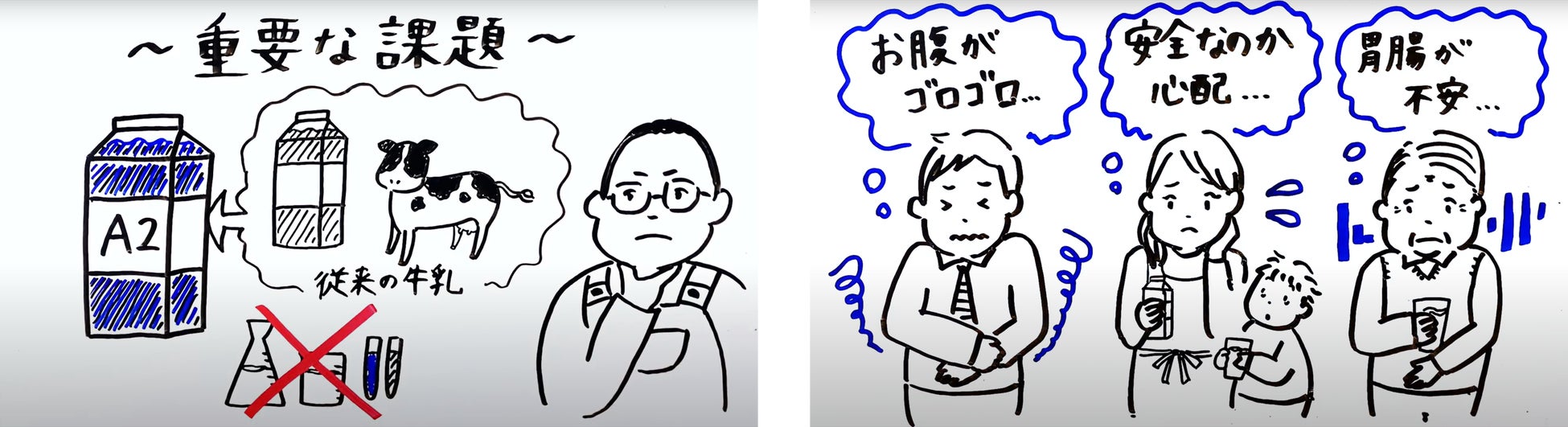 お絵描きムービーで構成されたストーリーは、日本A2ミルク協会の創設者でもあり代表理事を務める藤井雄一郎が、酪農業を営むなかで数々の苦難と対峙した結果、経営戦略を大変革し試行錯誤するなか、A2ミルクとの出逢いを通じて、酪農業界の未来のために立ち上がった軌跡を伝えています。厳しい時代が続く日本の酪農業界を救うために、自費を投じて挑む牧場経営者の勇気溢れるストーリーをぜひ多くの方にご覧いただけましたら幸いです。
