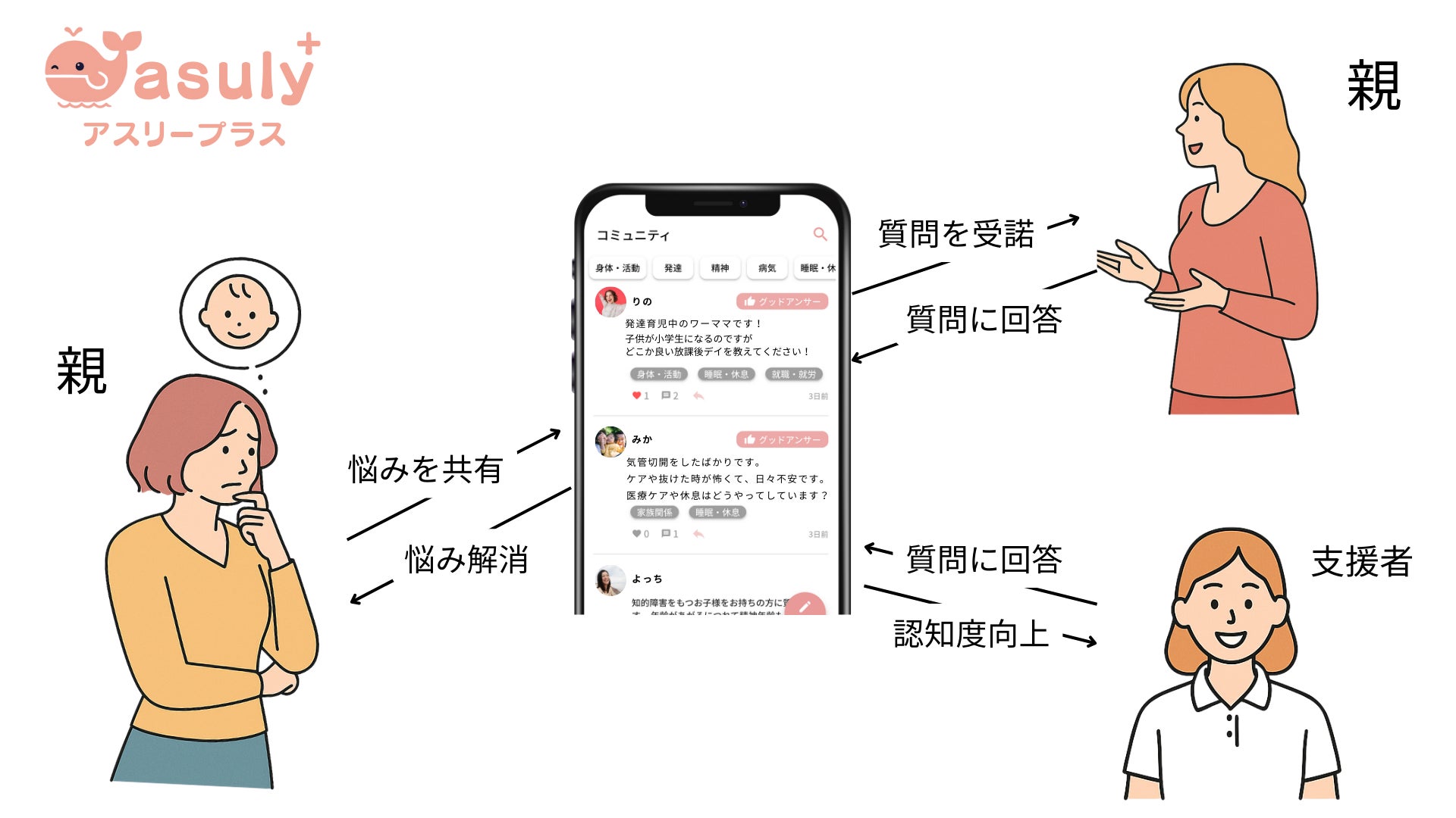 アスリープラスでは、日々の悩みや困りごとを投稿でき、同じ境遇の親や支援者から、リアルな共感や助言が寄せられます。