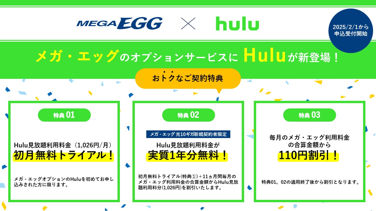 インターネット接続サービス「メガ・エッグ」のオプションサービスに「Hulu」が新登場