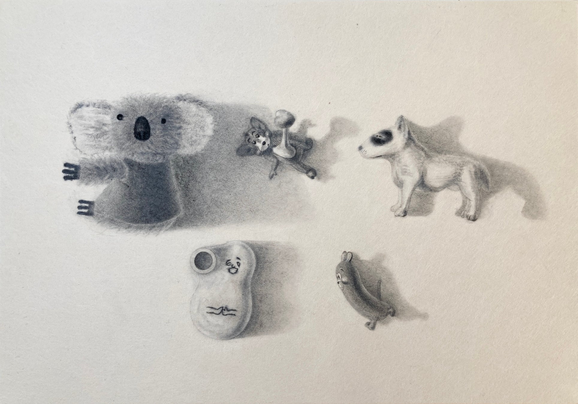 江波戸は、モノクロームは自身の心の在りようと重なり「静かで遠い感じ」が気に入っていると話します。そして、モノクロームで描くにあたり、最も重要な要素は絵の骨格となる構図であると述べています。その理由として、モノクローム描写が、人間で例えると服をきていないそのままの状態と同じで、色みやマチエールでの誤魔化しが効かないからだとします。また、無駄のないバルール※をとことん探求することで、描写は更に鮮やかな強度のあるものとなり、ぬいぐるみの毛の一本一本、影に反射する光の粒子まで見通せるように見えます。モノクローム描写への飽くなき探求は江波戸作品の真骨頂を生み出していると言えるでしょう。