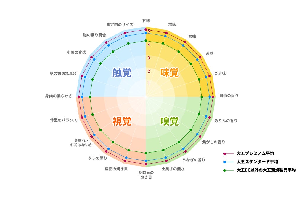 大五うなぎ工房で作られる蒲焼商品には、国内の契約養鰻場で育てたうなぎを「柔らかさ」「脂のり」「骨っぽさ」「コク」など合計20項目100点満点の厳格な基準で評価を行い「大五蒲焼」の名を製品に冠することが出来るのは、数百万尾のうなぎの中から80点以上のうなぎのみ。最もポピュラーな「大五蒲焼」は、年間累計販売数312万尾以上を販売しており、各ショッピングモールでもランキング1位を獲得している人気商品です。