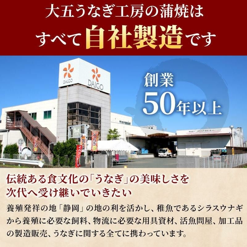 静岡県は“うなぎ養殖発祥の地”です。静岡県島田市にある「大五うなぎ工房」は、昭和50年より全国の飲食店に活鰻の卸売り、自社工場での白焼・蒲焼加工を行っています。厳選した国産うなぎを熟練の職人が活きたまま1尾ずつ割き、独自調合した秘伝のタレを使い、そして絶妙な火加減で、上品な色艶で食欲をそそる贅沢なうなぎ蒲焼に仕上げ「大五蒲焼」としてお客様に提供しています。