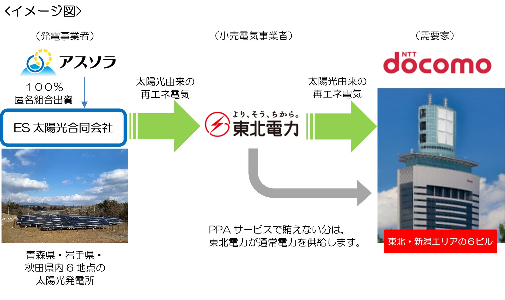 本サービスは、アスソラが100%匿名組合出資する、ES太陽光合同会社が保有する太陽光発電所(計6地点:合計定格出力6,346kW※2)で発電した再生可能エネルギー(以下「再エネ」)由来の電力を、ドコモが東北・新潟エリアに保有する自社ビルへ、小売電気事業者である東北電力が2025年1月29日から長期間にわたって供給するものです。