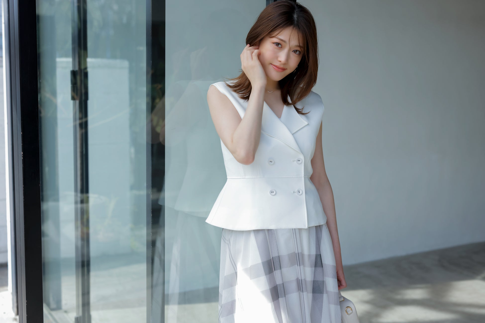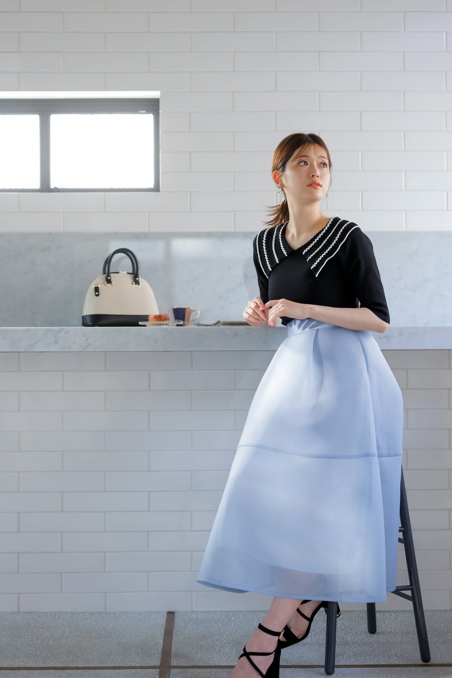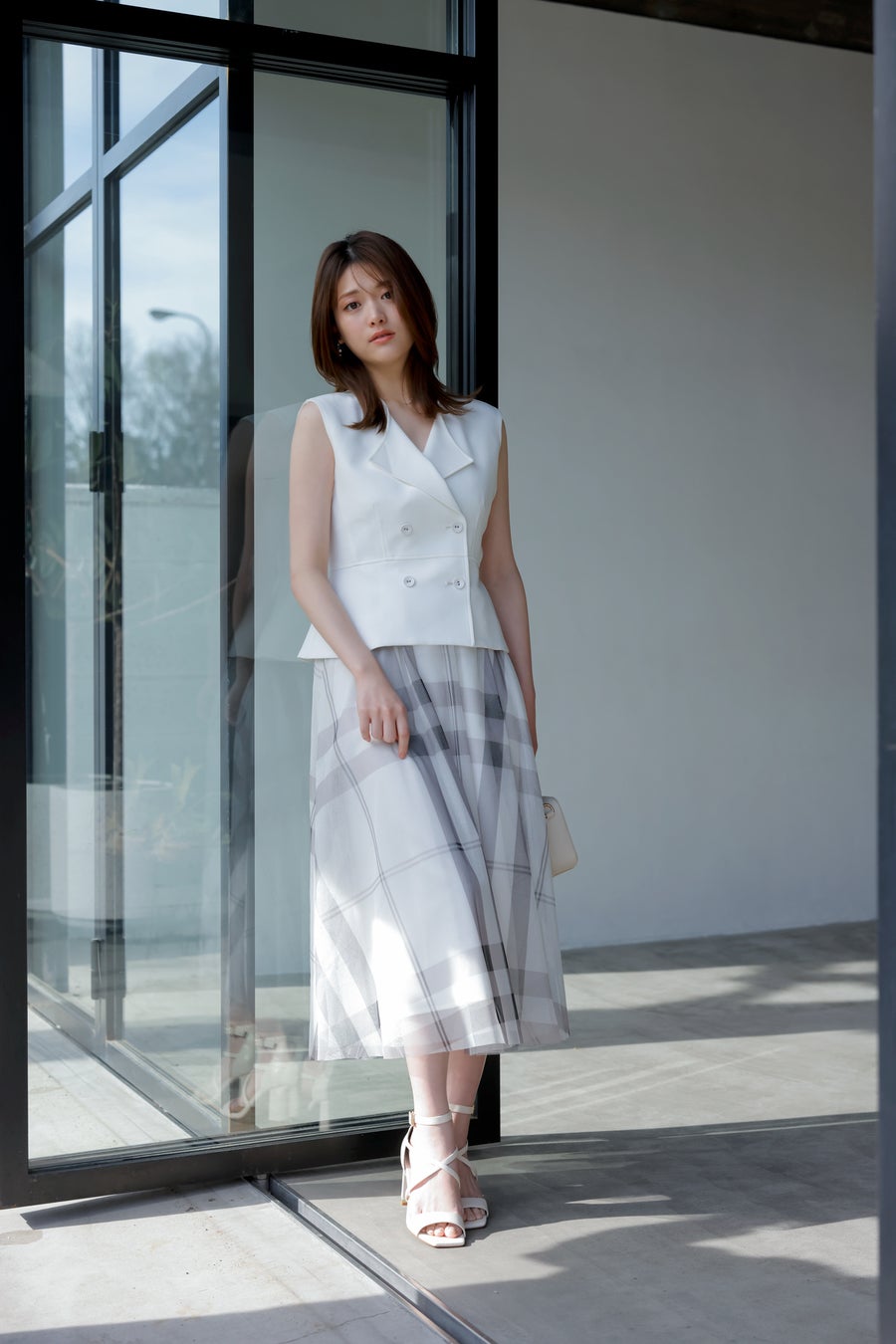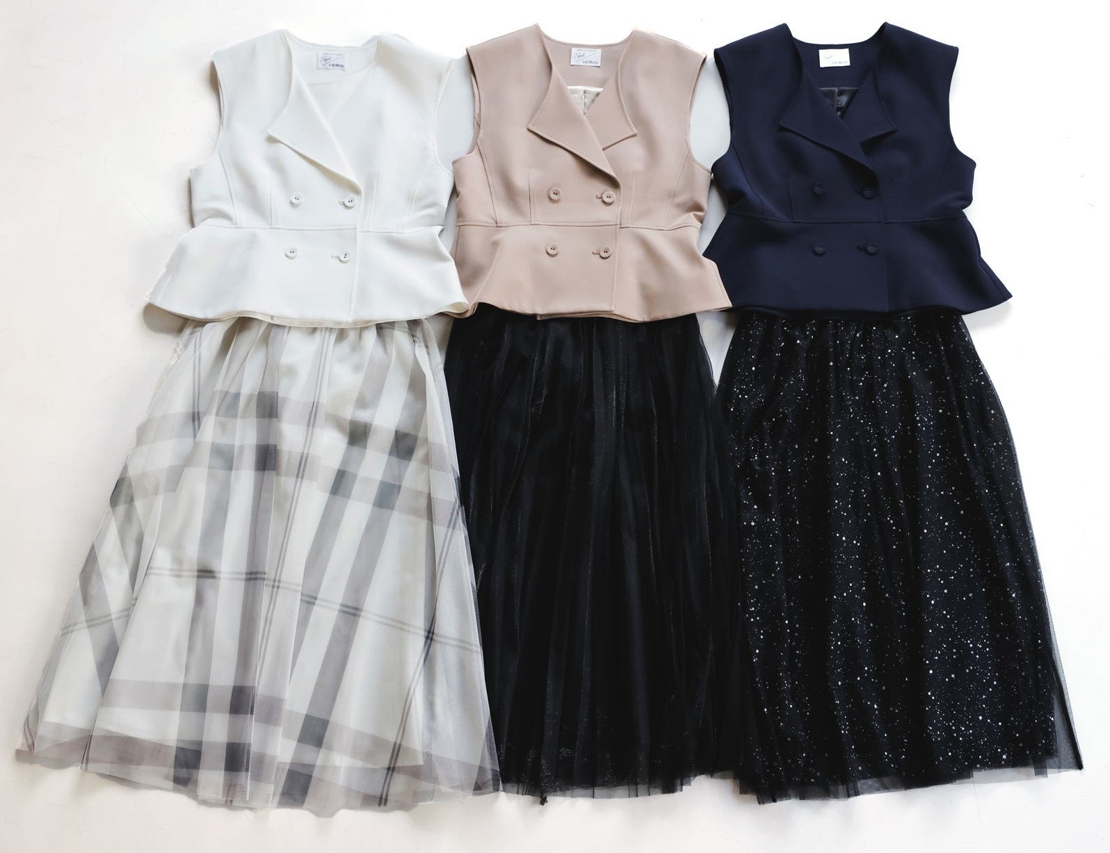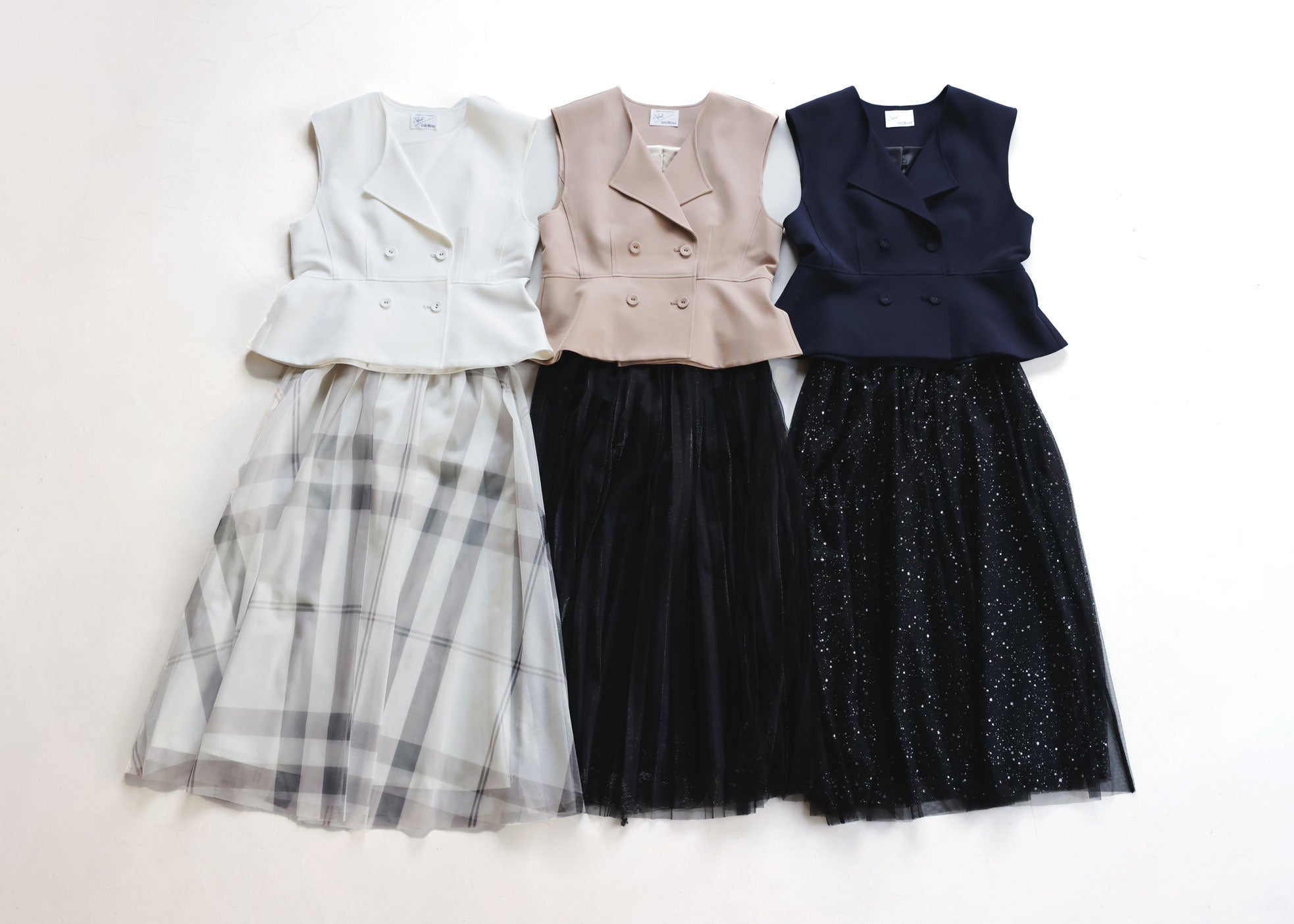 ショート丈でスッキリとしたペプラムデザインのジレと、チュールの程よいボリューム感のフレアスカートによって大人フェミニンなムードに。タックとパネルライン切替で、体のラインに沿わせたディティールを取り入れ、バランスのとれたシルエットもポイントです。