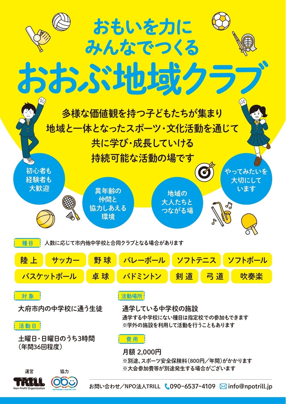 【大府市×TRILL】NPO法人TRILLは、愛知県大府市における部活動地域展開事業として「おおぶ地域クラブ」を発足、新規会員の参加申込受付を開始します。
