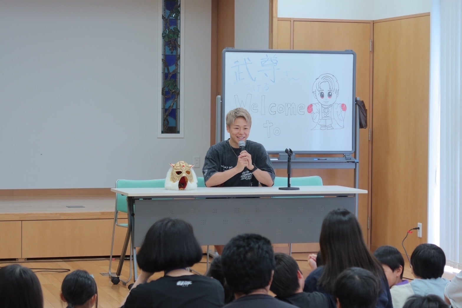 早速集まった子どもたちの前に姿を現すと、盛大な拍手と共にホワイトボードに描かれた武尊とタイガーマスクのイラストで歓迎を受けました。