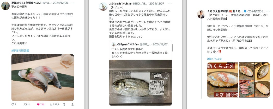 「世界一旨い魚を創り、届ける」を企業理念とする株式会社さかなドリーム(本社:千葉県館山市)は、2024年12月上旬に世界初の養殖魚「夢あじ」の第1回テスト販売を実施しました。大人気ユーチューバー「きまぐれクック」での紹介が大きな話題を呼び、中島水産では初日から連日完売となりました。2025年1月7日(火)より、サカナバッカ中目黒にて第2回テスト販売を【50尾限定(期間計)】で実施いたします。