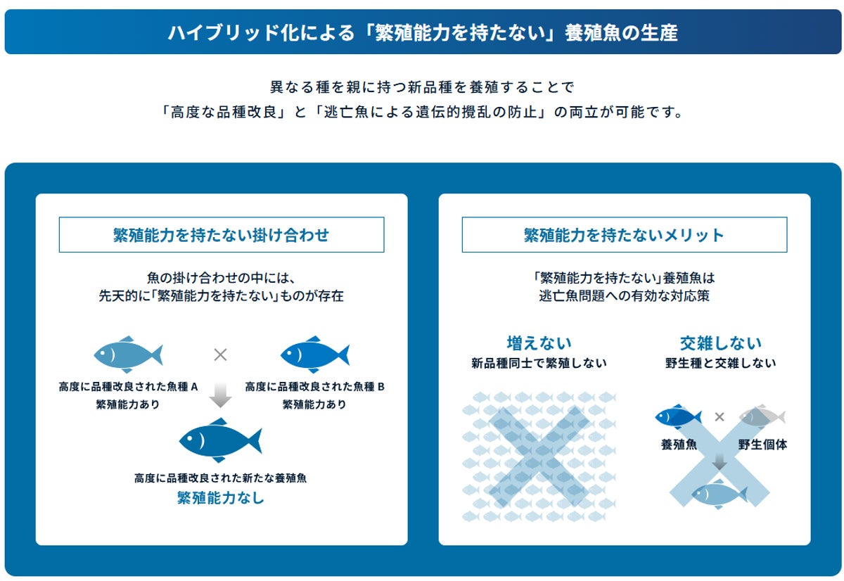 「夢あじ」は精子や卵のもととなる幹細胞を持たない「一代限りの養殖魚(繁殖能力を持たない魚)」です。そのため、自然災害などで魚が生け簀から逃亡した際にも、天然のカイワリやマアジとの交配が発生せず、生態系への悪影響を防ぐことができます。さかなドリームは、“品種改良された美味しい魚の養殖”と“生態系のサステナビリティ”の両立を実現することで、養殖魚の新たな可能性を模索していきます。