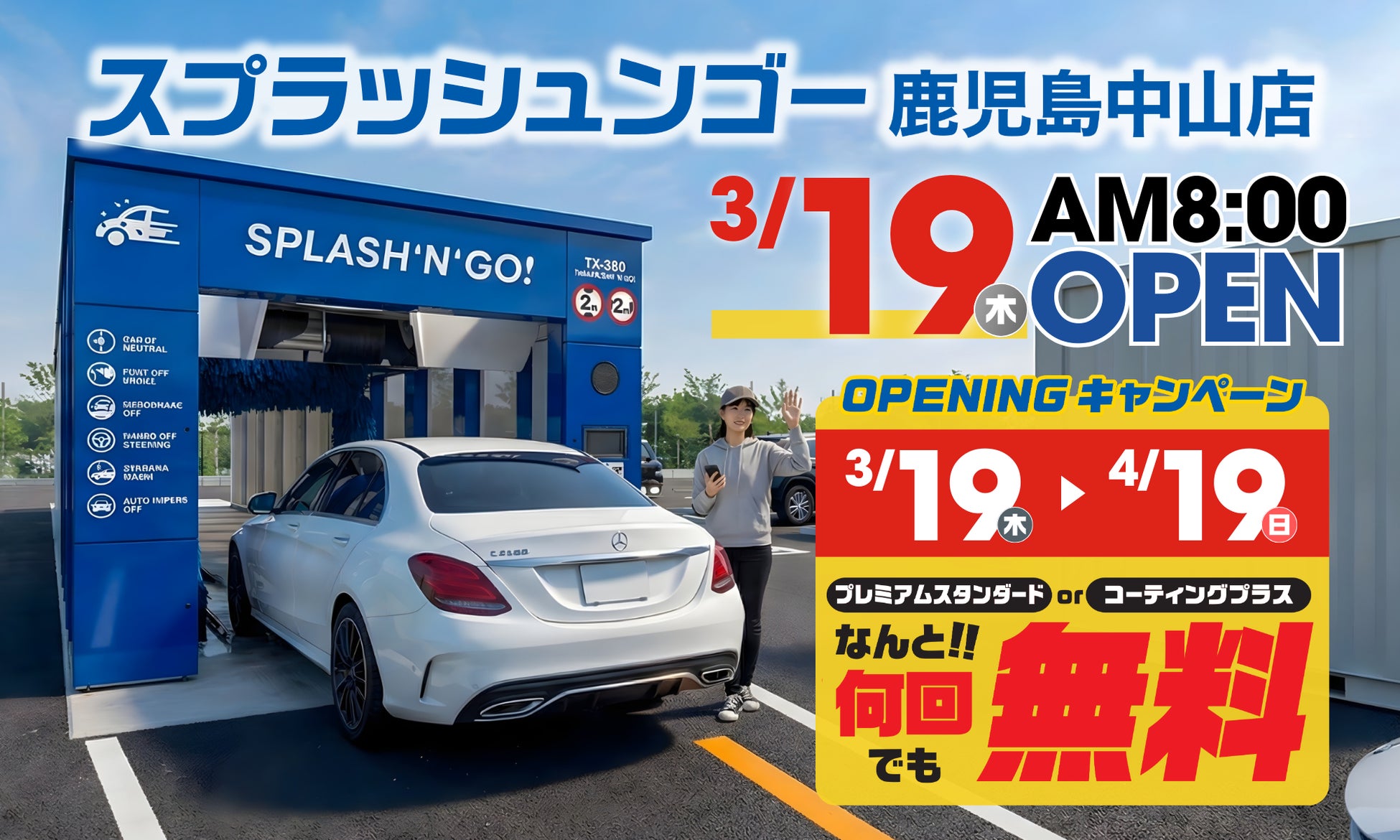 オープンから1ヶ月は全コース無料開放。期間中のサブスク入会で5月末まで月額"サンキュー(39)円"——洗車渋滞のない日常が、鹿児島で始まります。