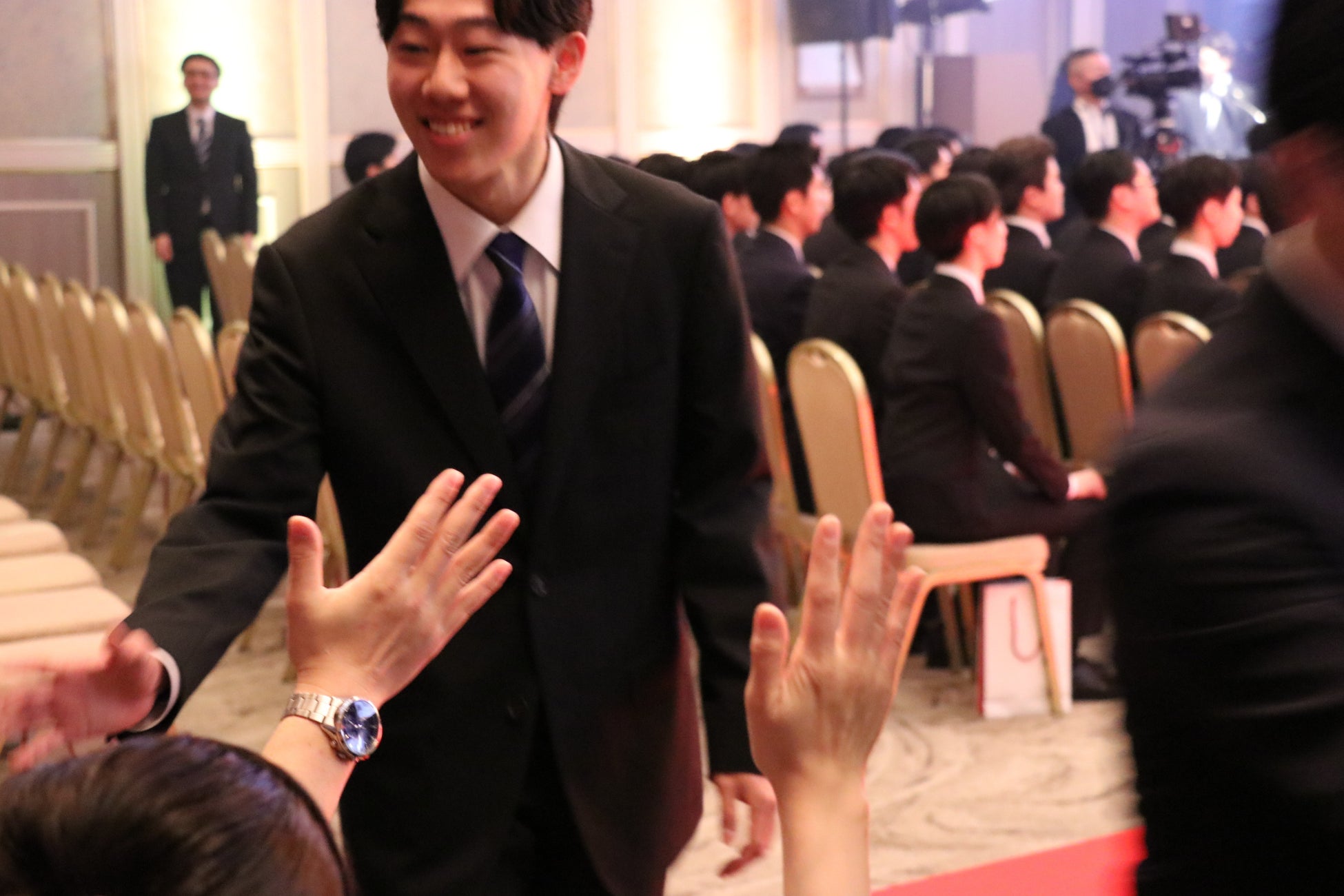 いくつもの新しい挑戦を始めるマルハン北日本カンパニーは、従来の入社式とは違ったエンターテイメント性があふれる入社式になりました。新入社員はレッドカーペットを歩きながら、役員や幹部、先輩社員とハイタッチを交わすなど、笑顔あふれる入場からのスタート。